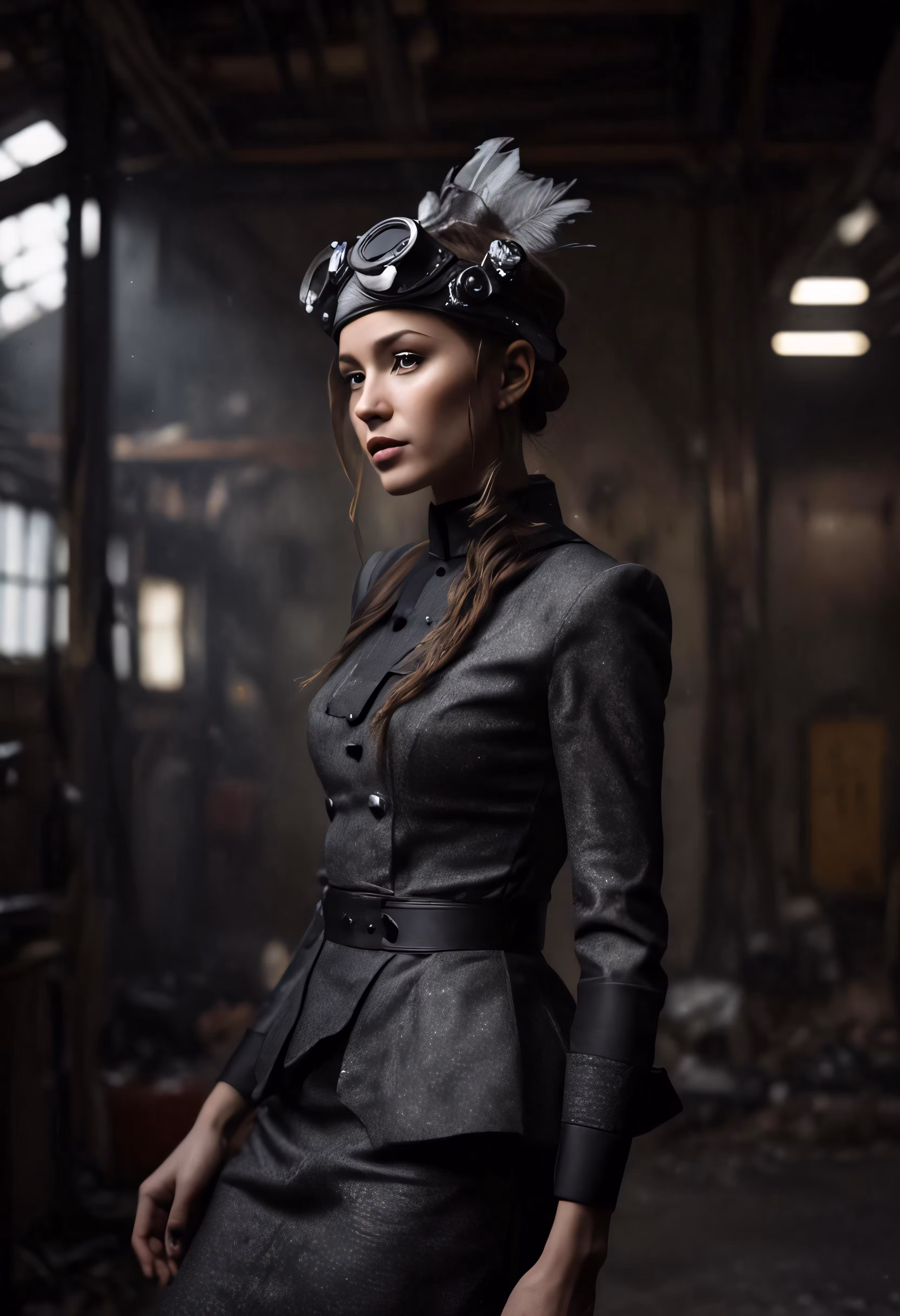High resolution picture, free to use, woman dressed in black with feathers, leather dress and hat