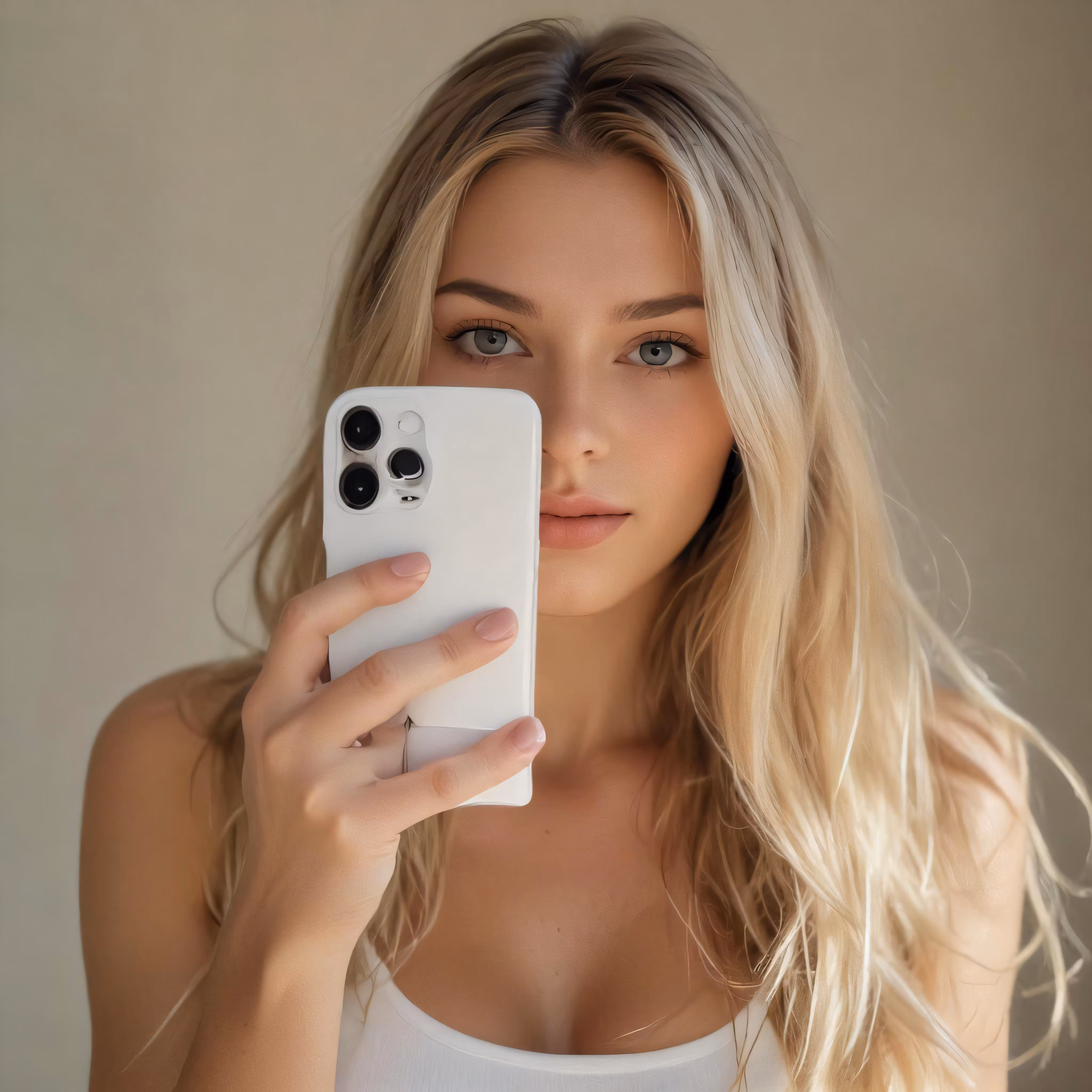 High resolution picture, free to use, woman holding her white cellphone up to her face