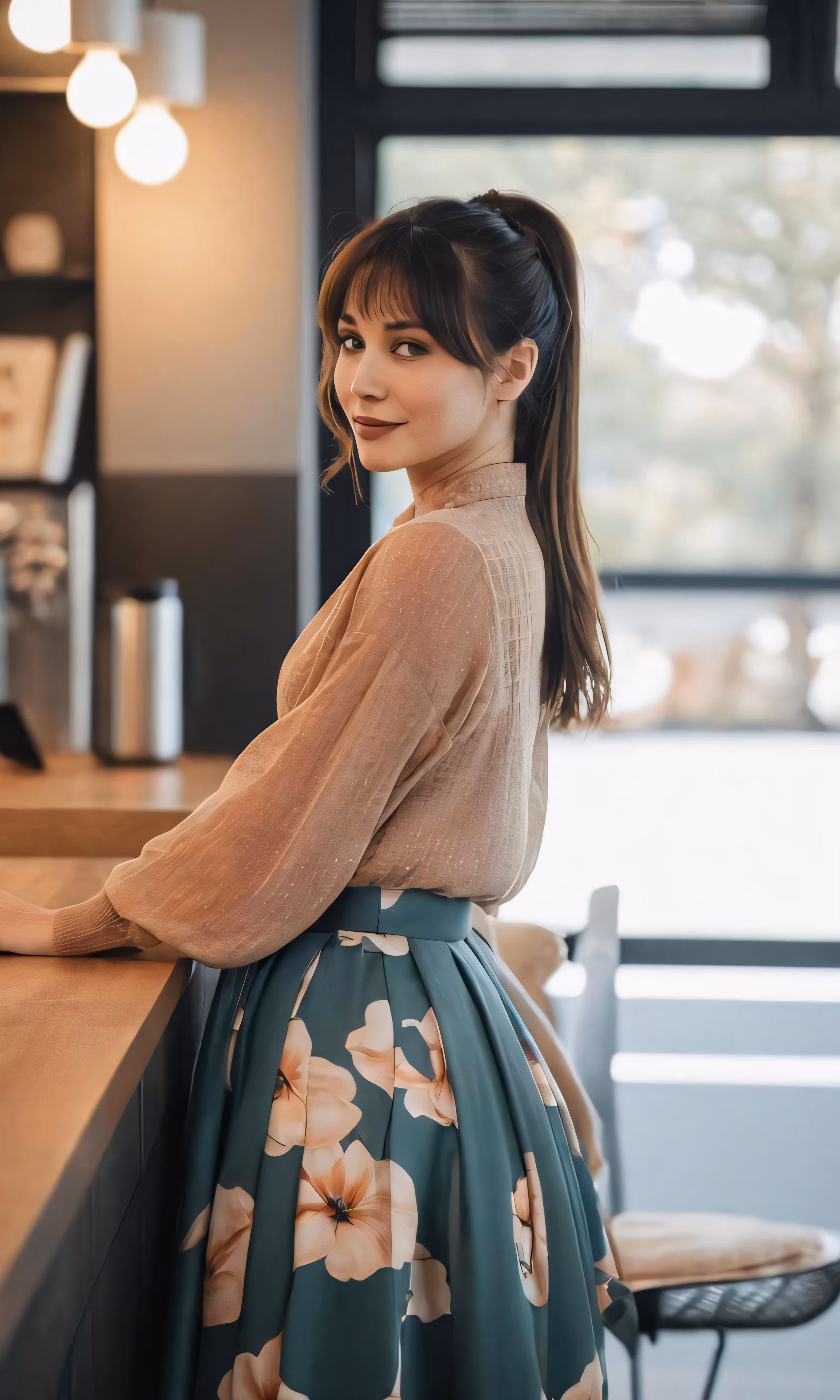 High resolution picture, free to use, woman in a brown sweater and green floral skirt