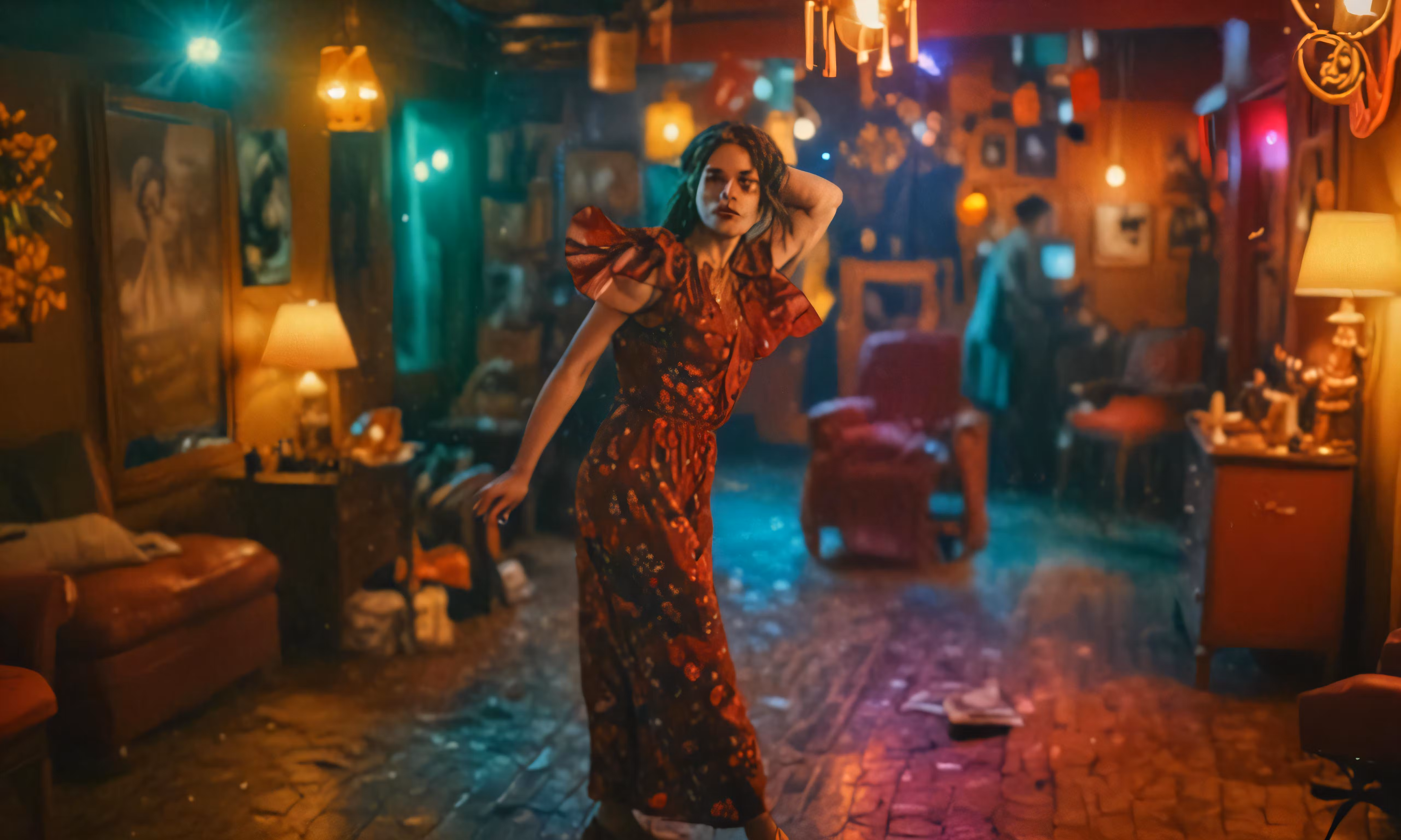 High resolution picture, free to use, woman in an evening dress dancing in the corner of a room