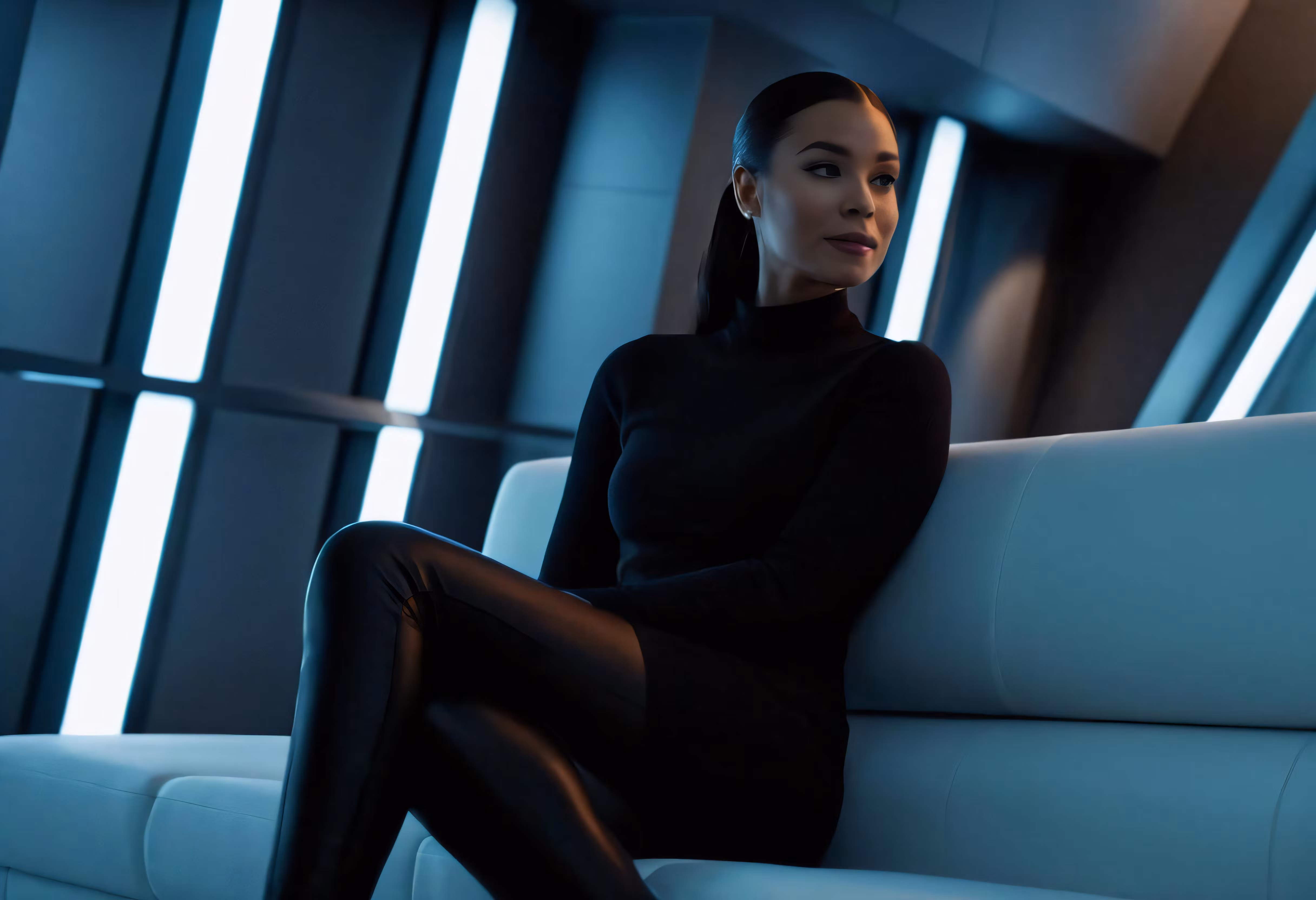 High resolution picture, free to use, woman in black sweater and pants sitting on a white couch