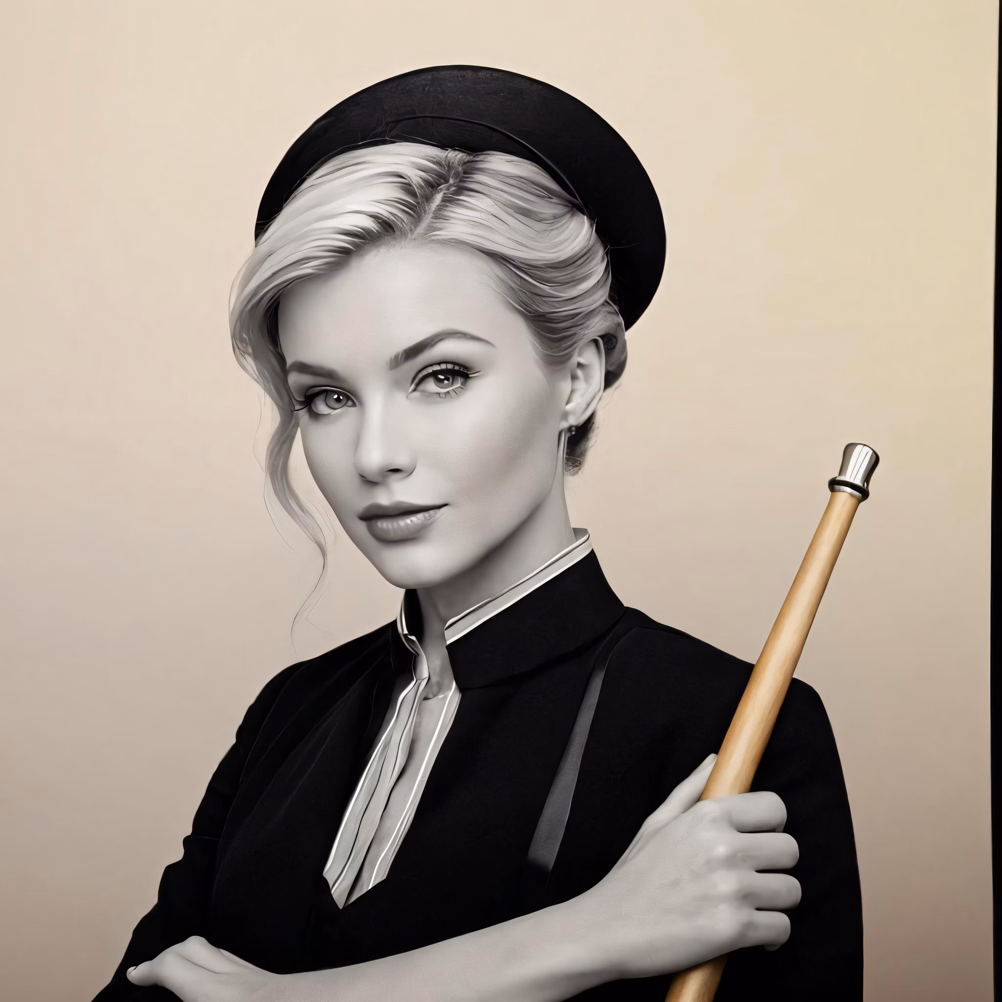 High resolution picture, free to use, woman in black uniform holding umbrella and posing for a picture