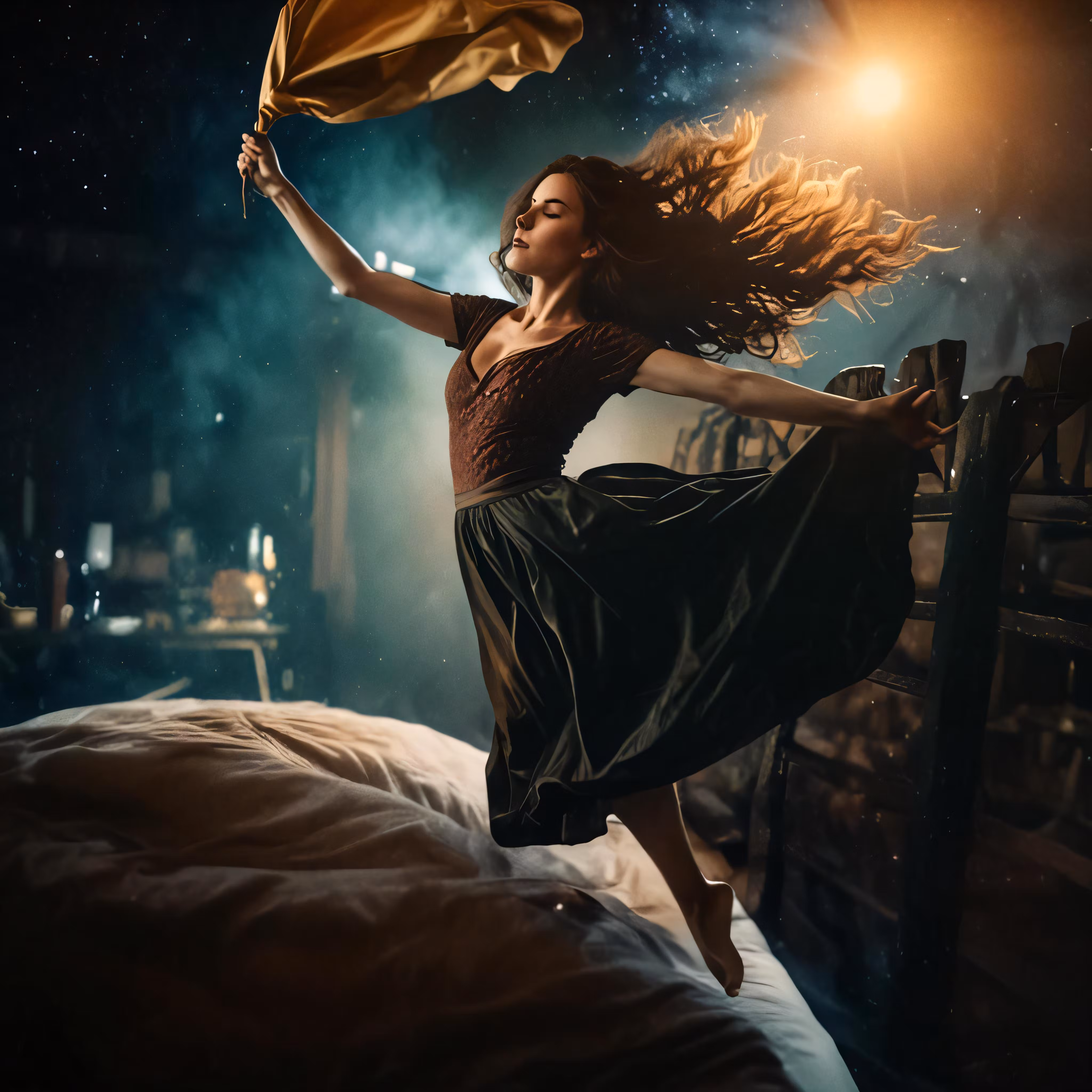 High resolution picture, free to use, woman in dress dancing on bed at night