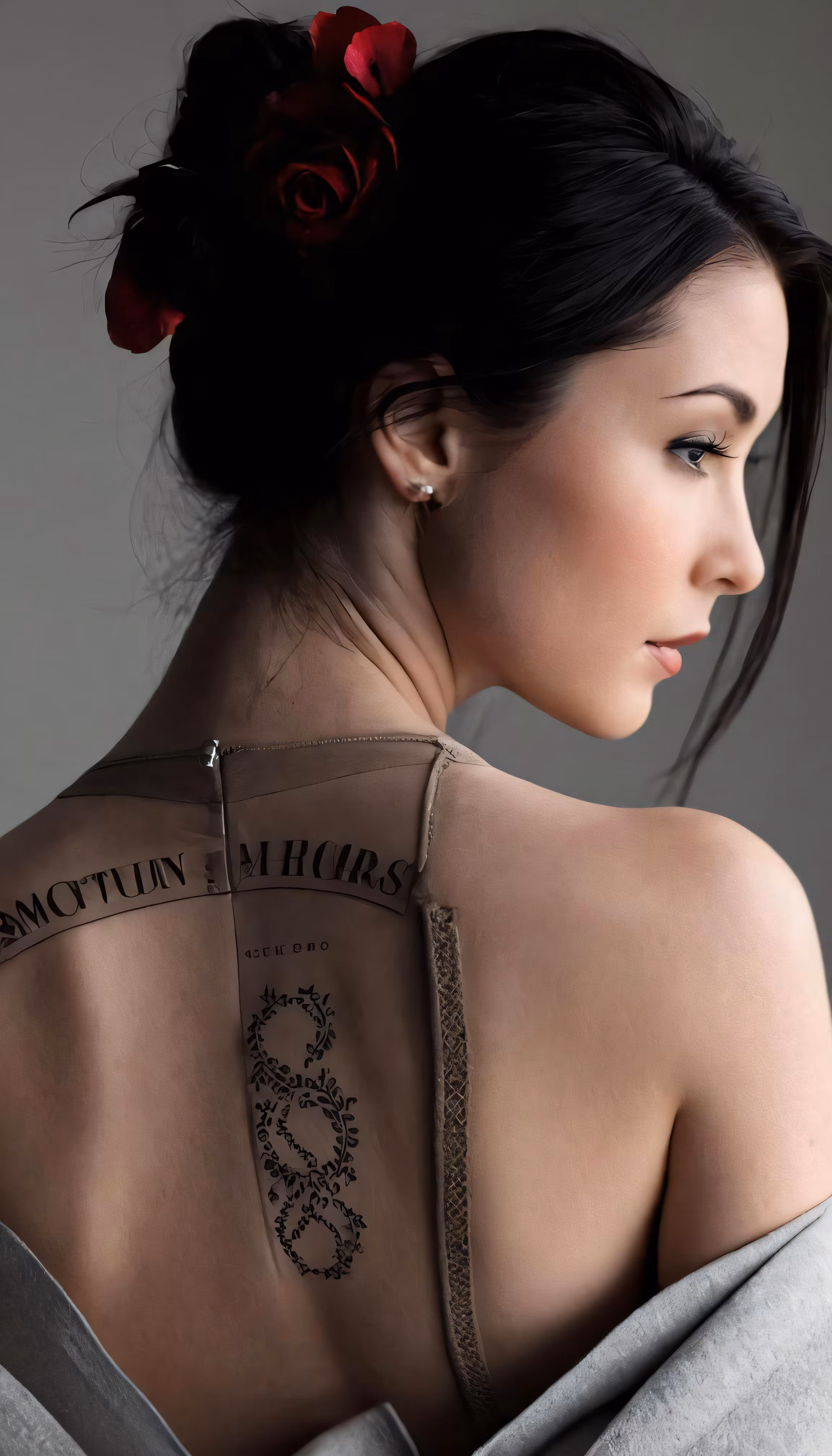 High resolution picture, free to use, woman in gray dress with tattoos and flower