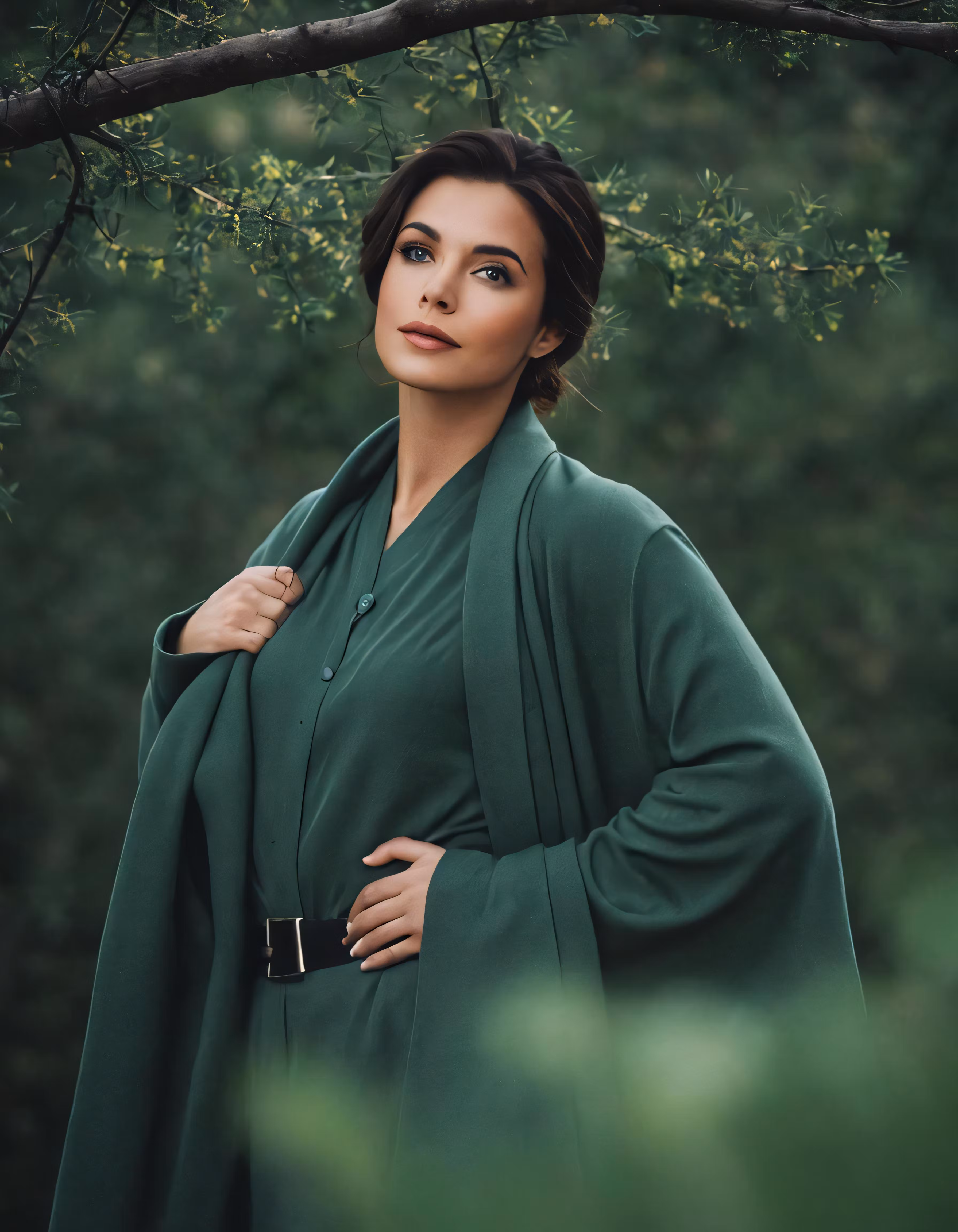 High resolution picture, free to use, woman in green wearing black shirt and green cloak