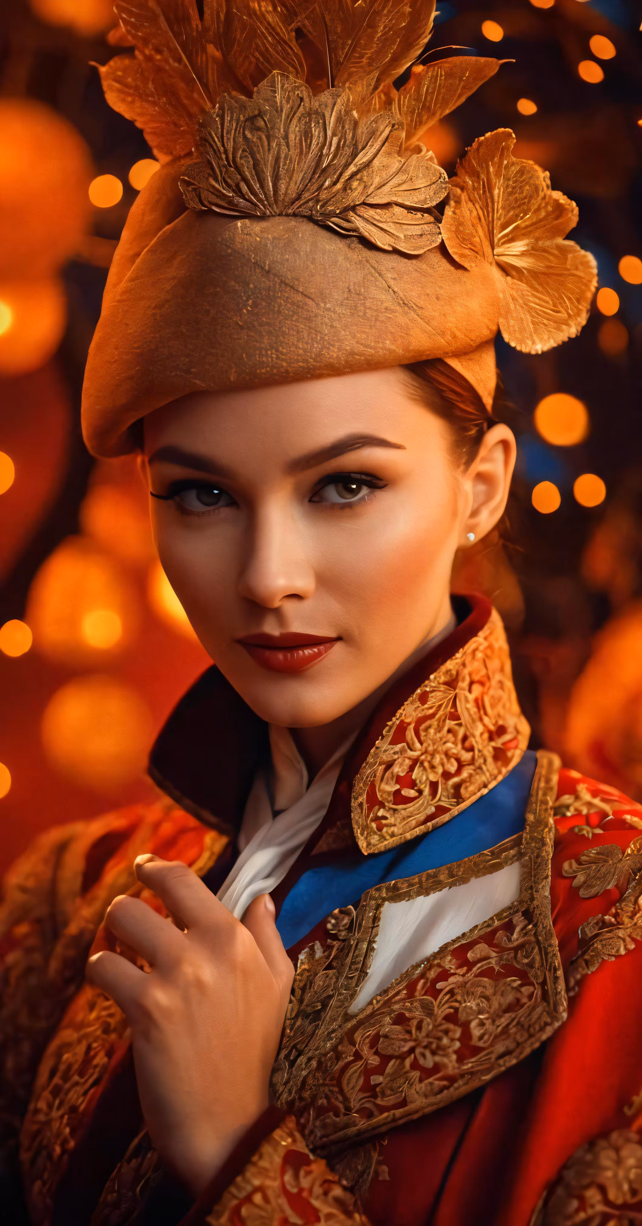 High resolution picture, free to use, woman in red and gold hat with leaf decorations on it