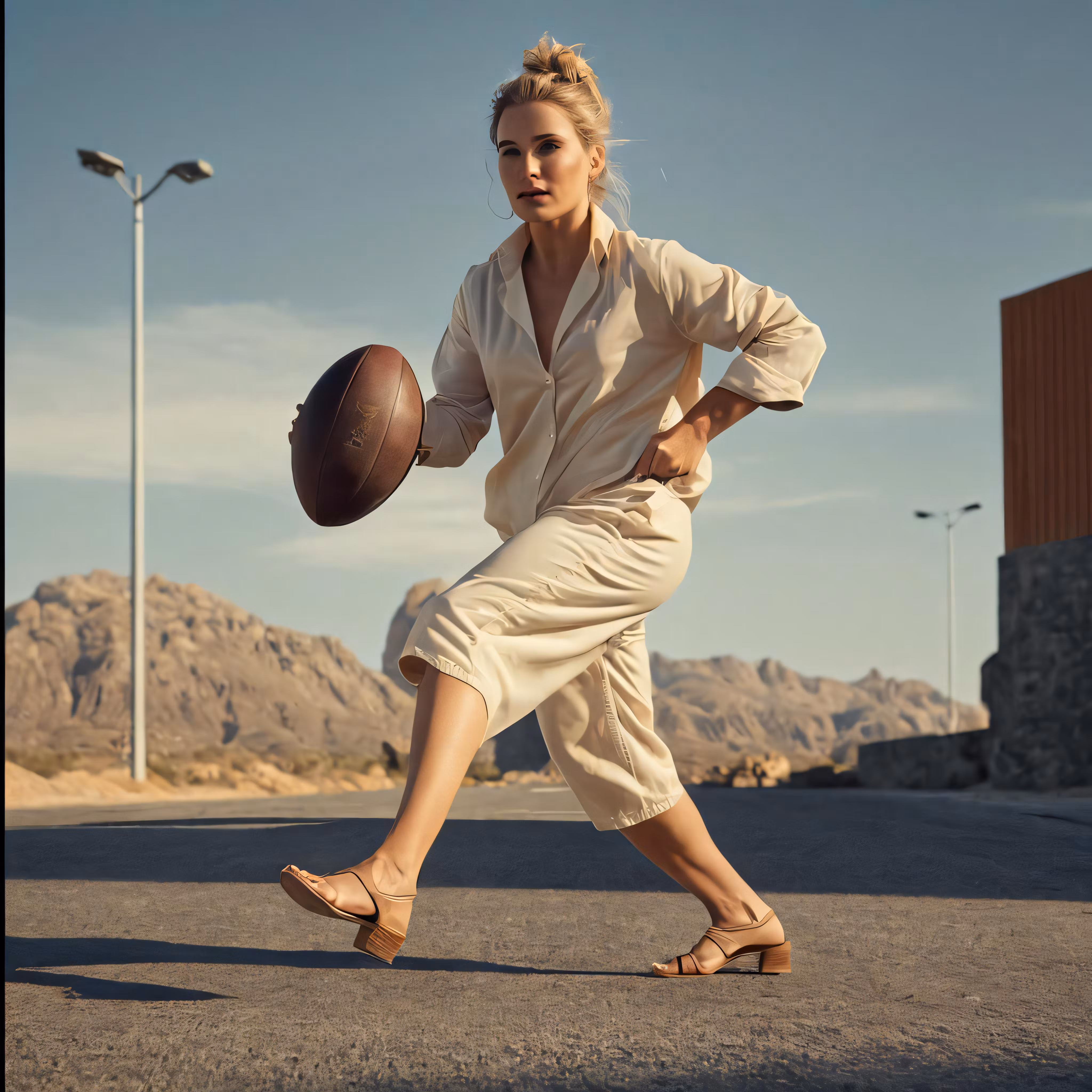 High resolution picture, free to use, woman in the middle of a road holding a ball and basketball