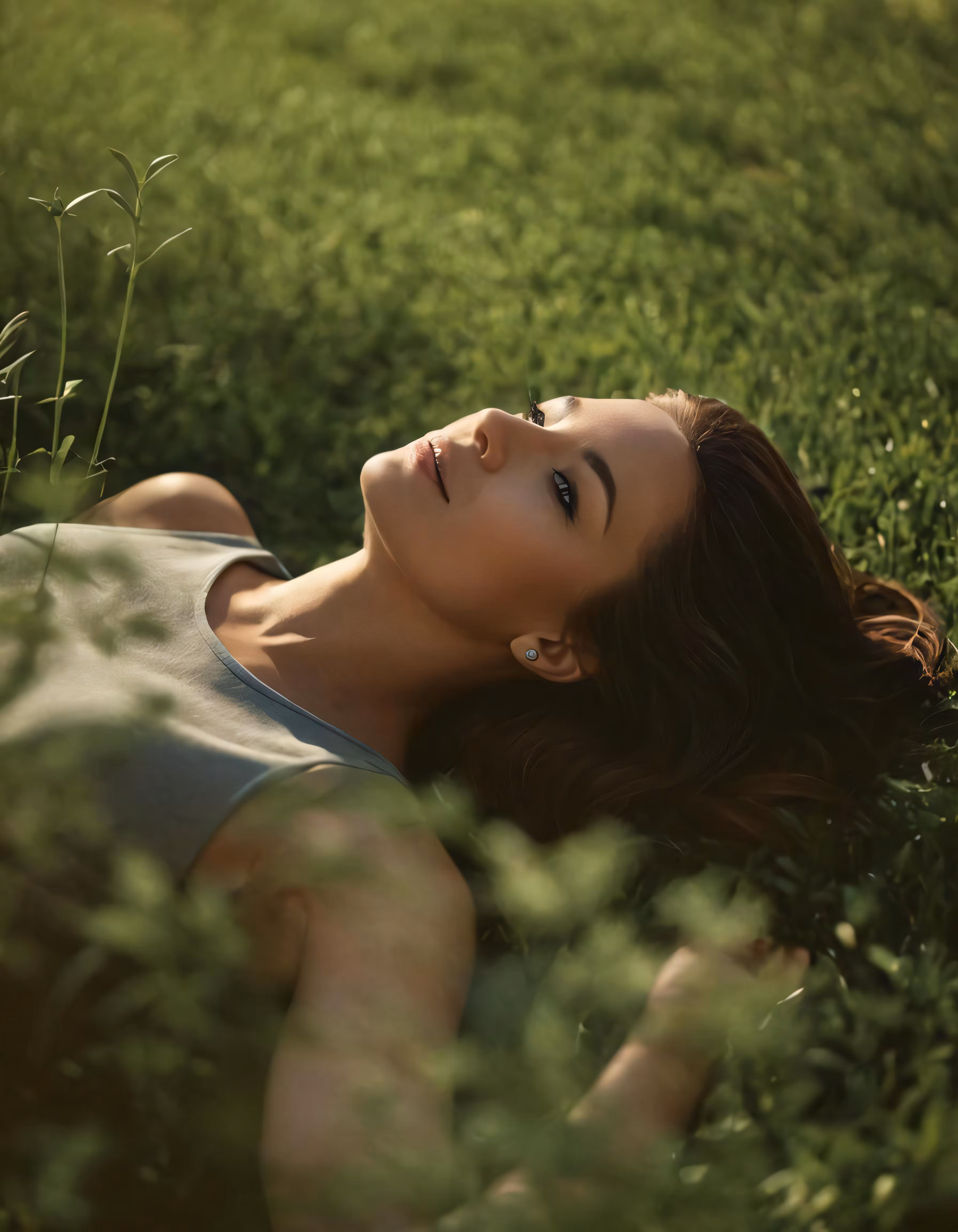 High resolution picture, free to use, woman laying on grass with ear piercings and an expression of sadness