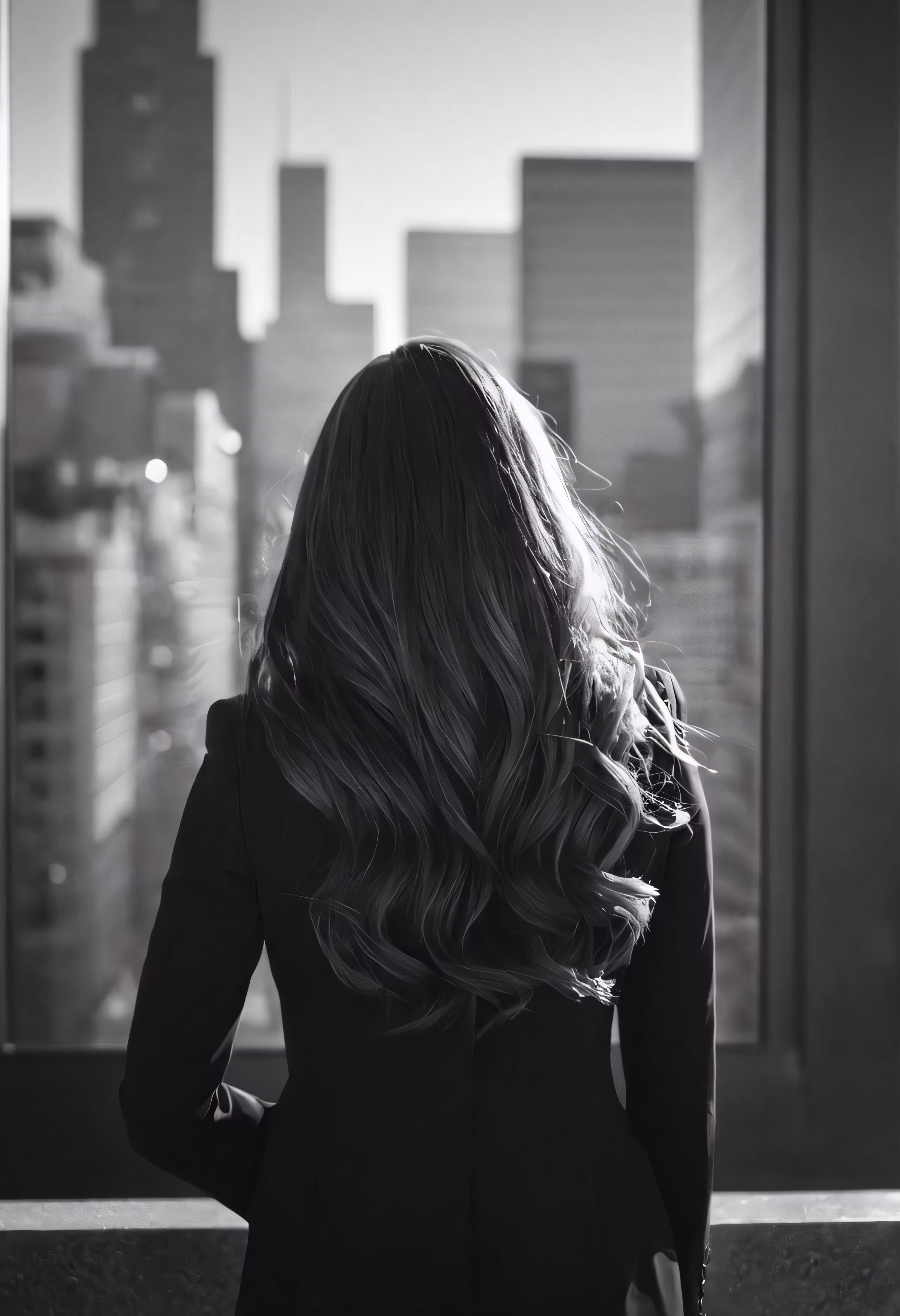 High resolution picture, free to use, woman looking out of window on the ledge of building in the city
