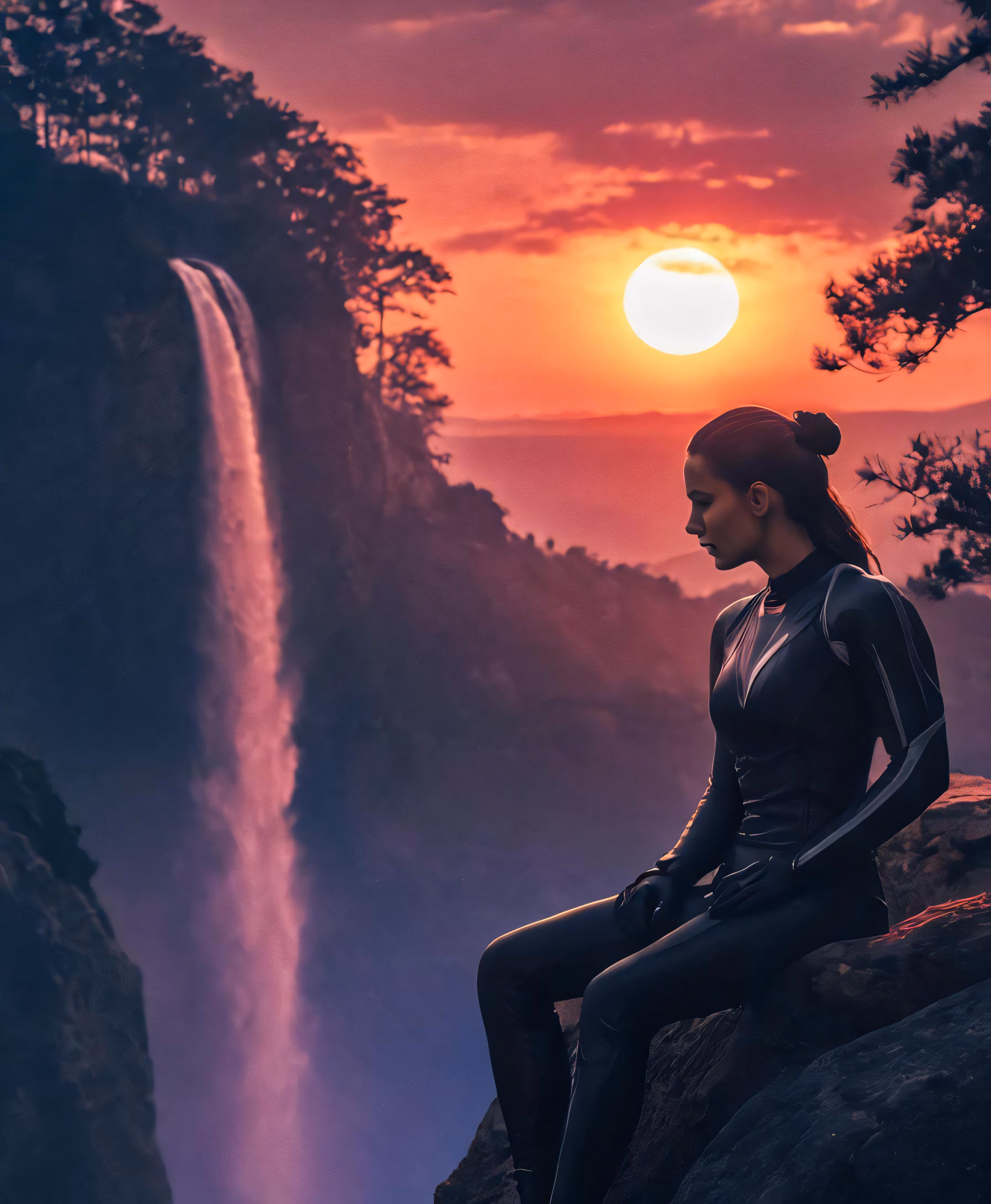 High resolution picture, free to use, woman on a cliff overlooks a large waterfall