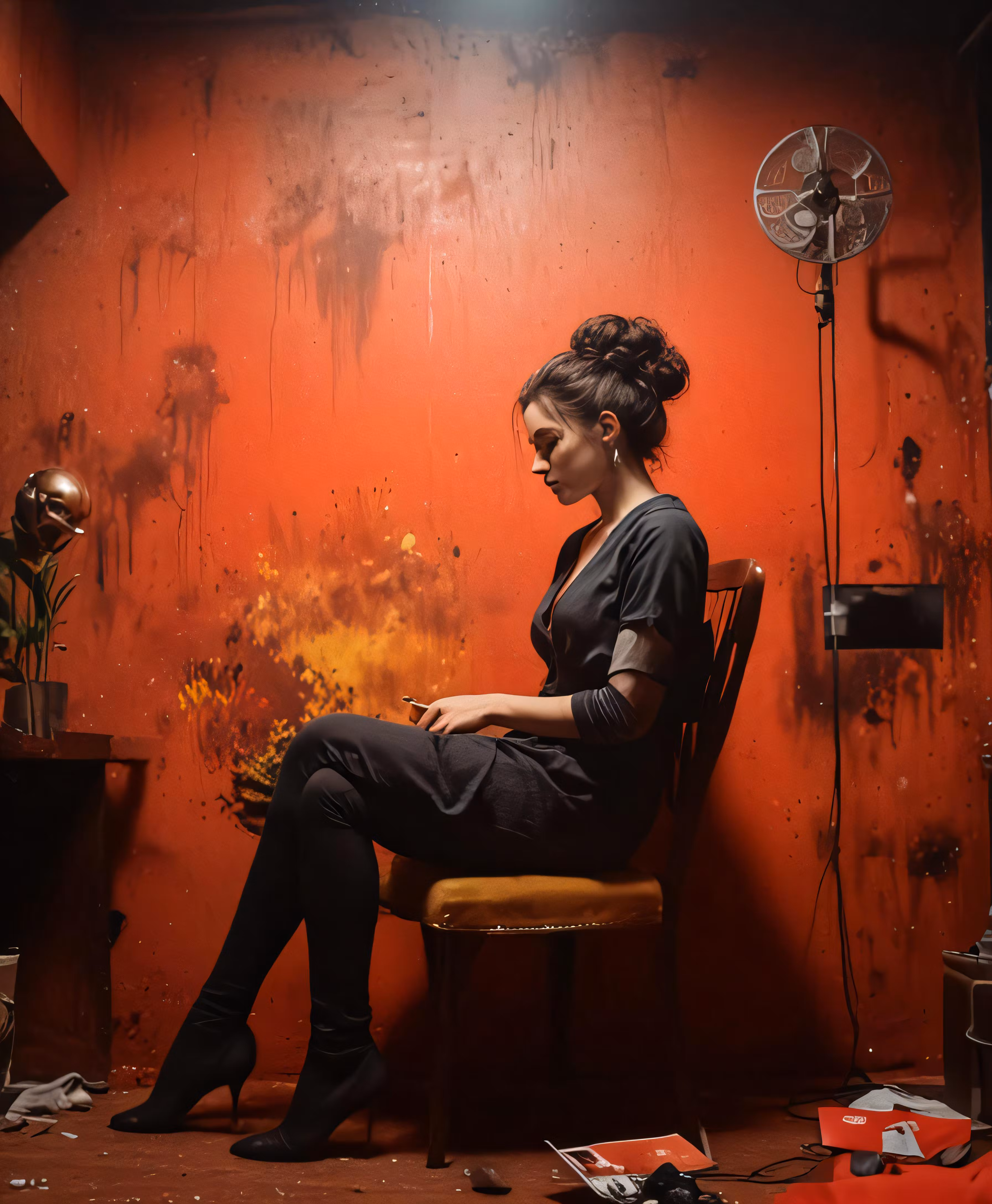 High resolution picture, free to use, woman sitting on a chair in an orange room