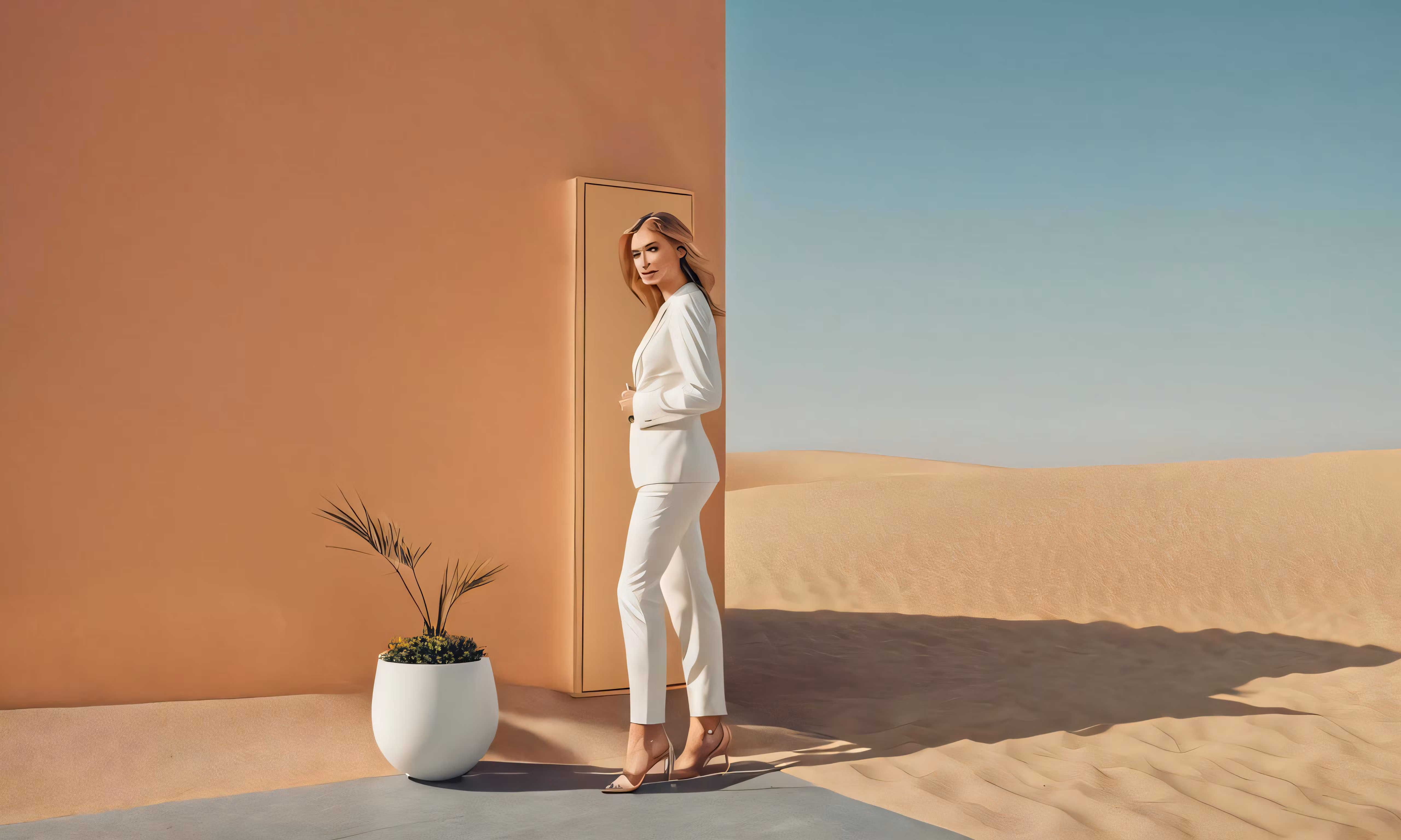 High resolution picture, free to use, woman standing against a tan wall and white planter