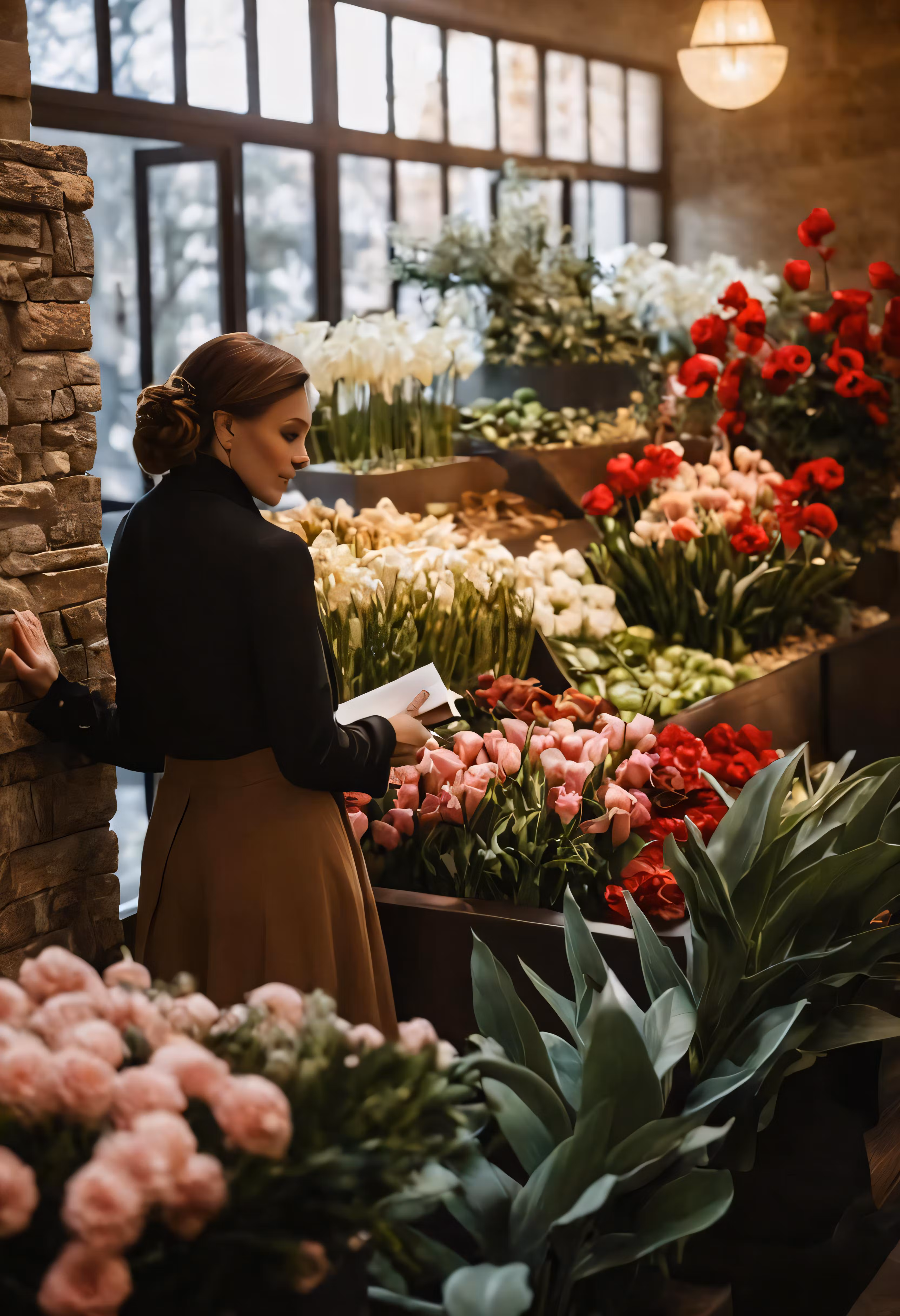 High resolution picture, free to use, woman standing behind a display of colorful flowers
