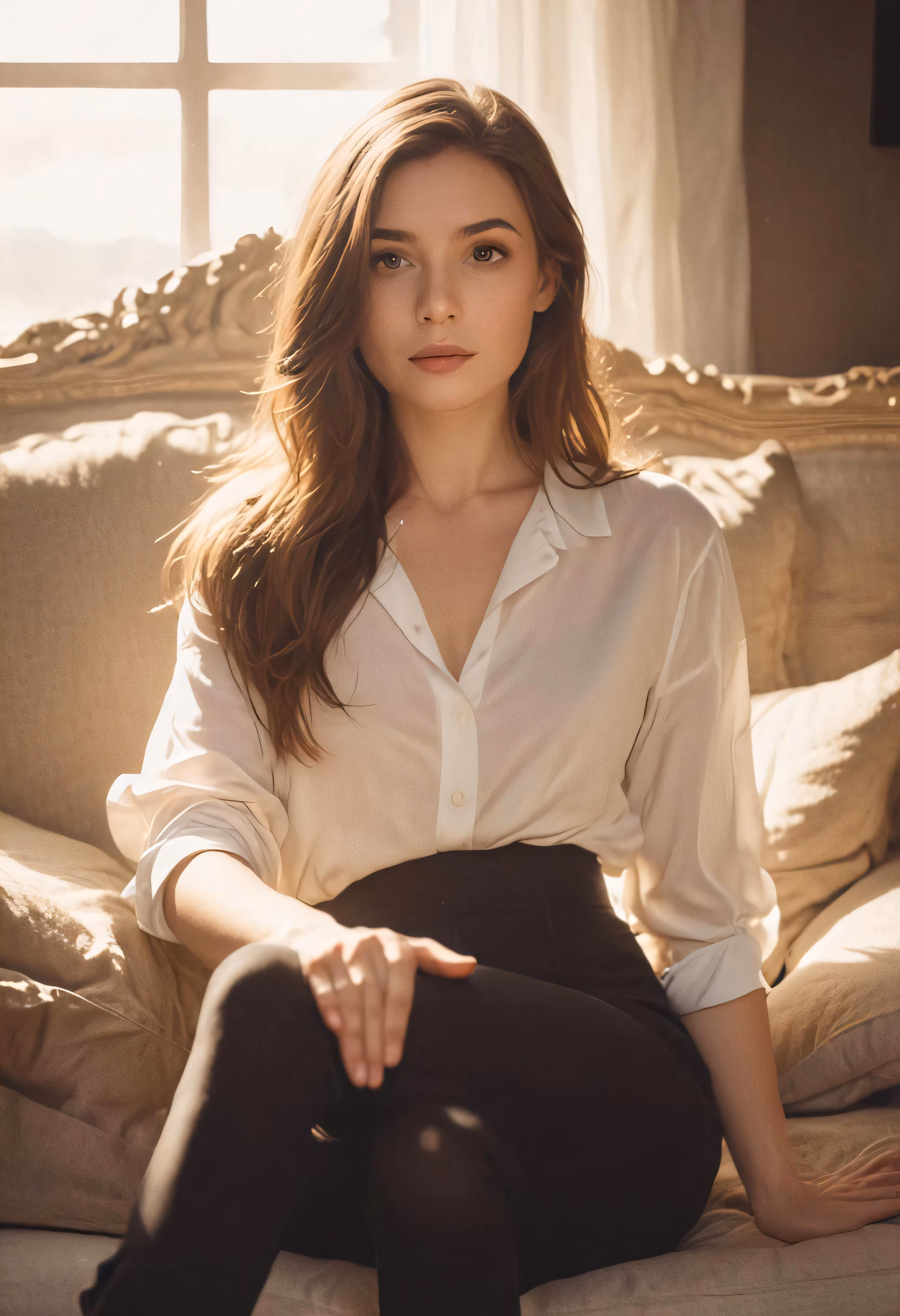 High resolution picture, free to use, woman wearing a white shirt sitting on a couch with her leg crossed