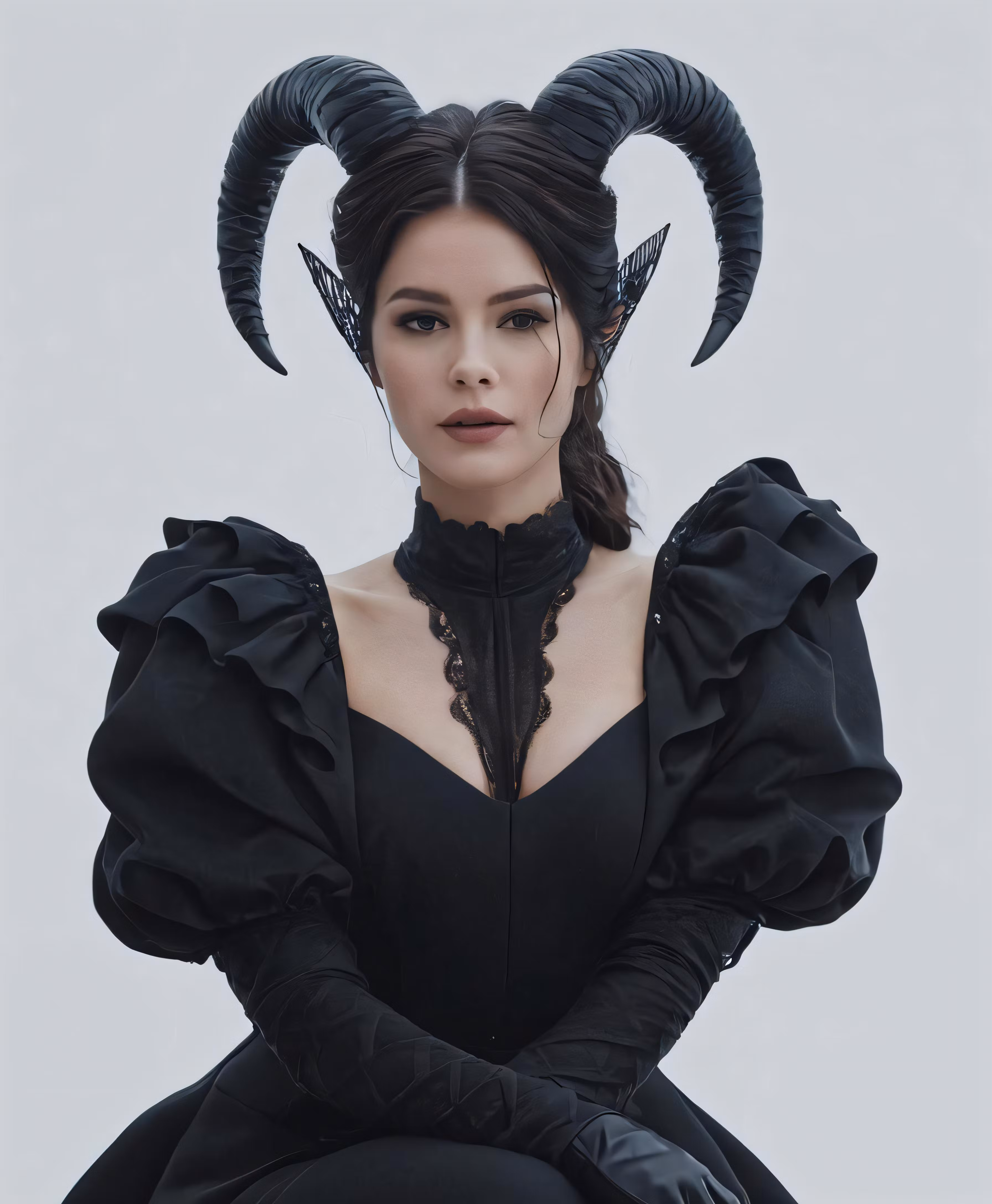 High resolution picture, free to use, woman wearing black dress and horns kneeling
