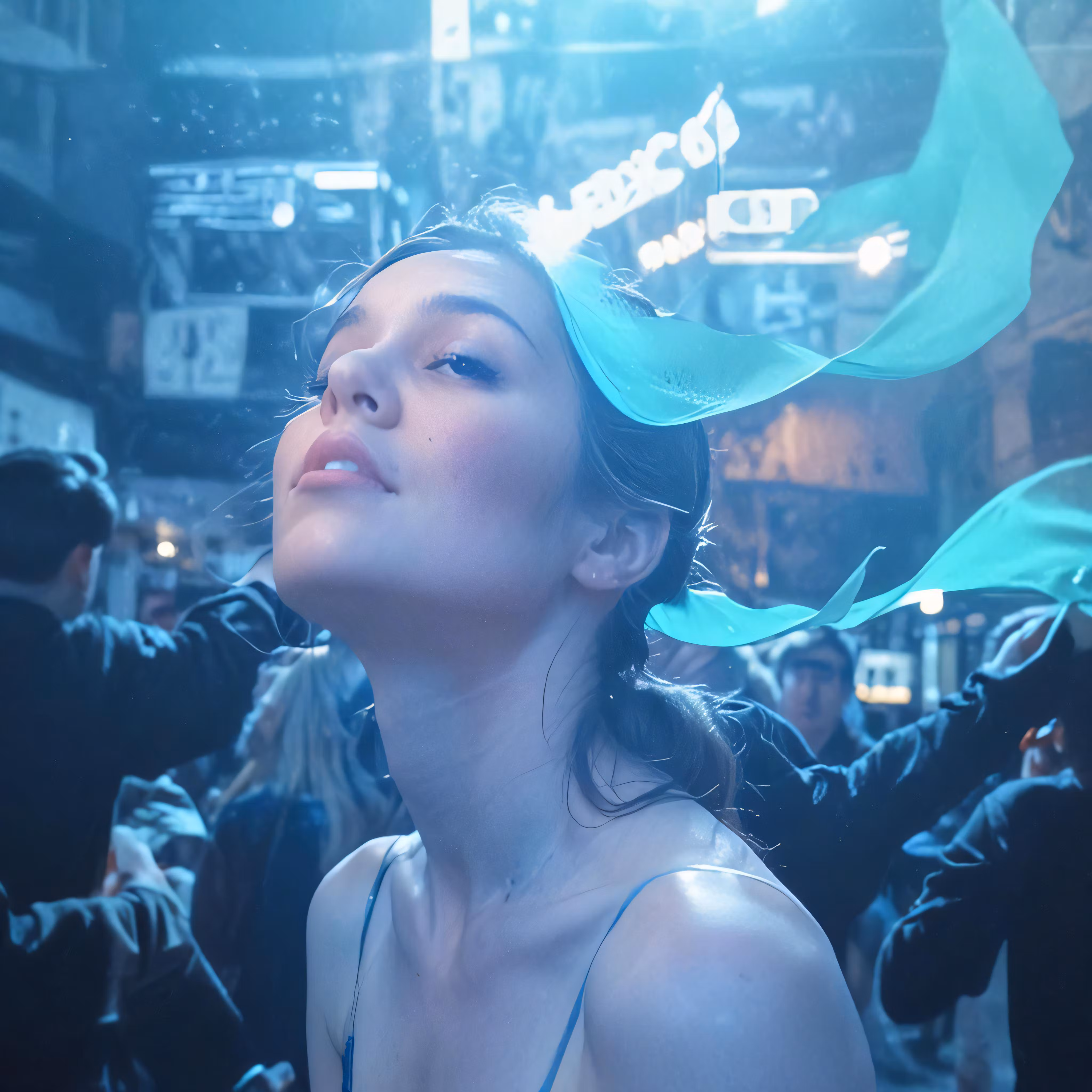 High resolution picture, free to use, woman with blue dress in crowded city square at night