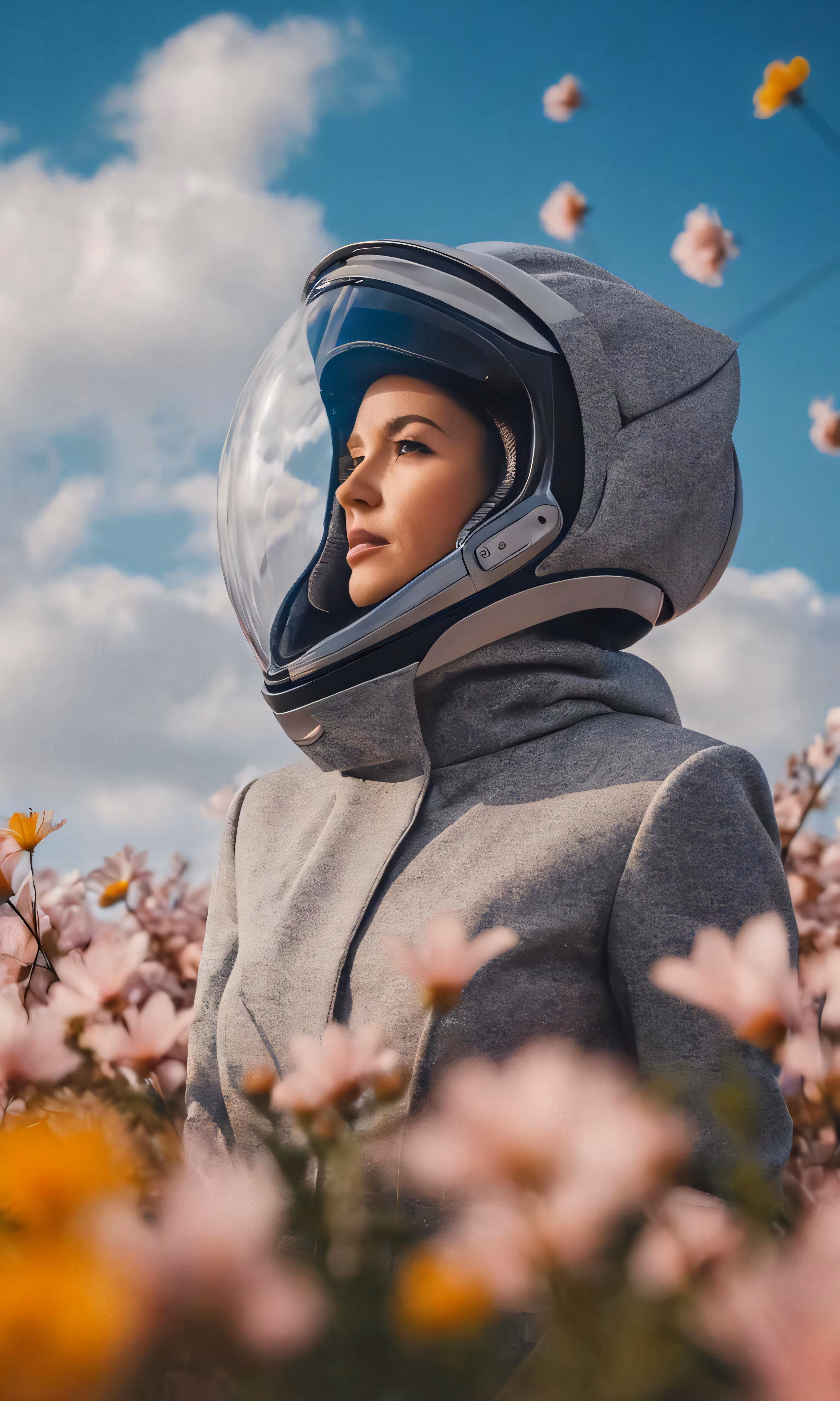 High resolution picture, free to use, woman with helmet and hood in a flower field