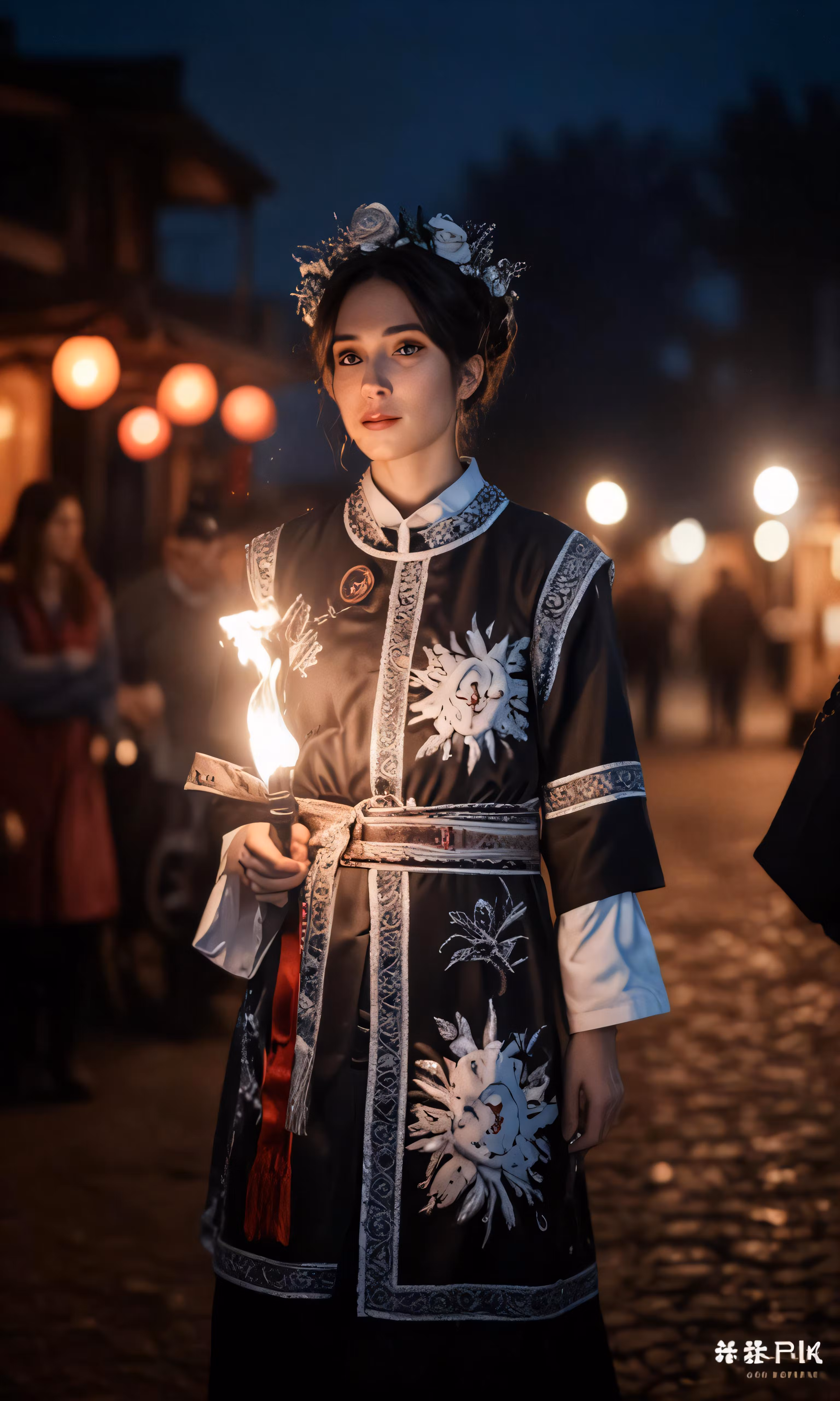 High resolution picture, free to use, woman with lighted candle in hand standing outdoors at night