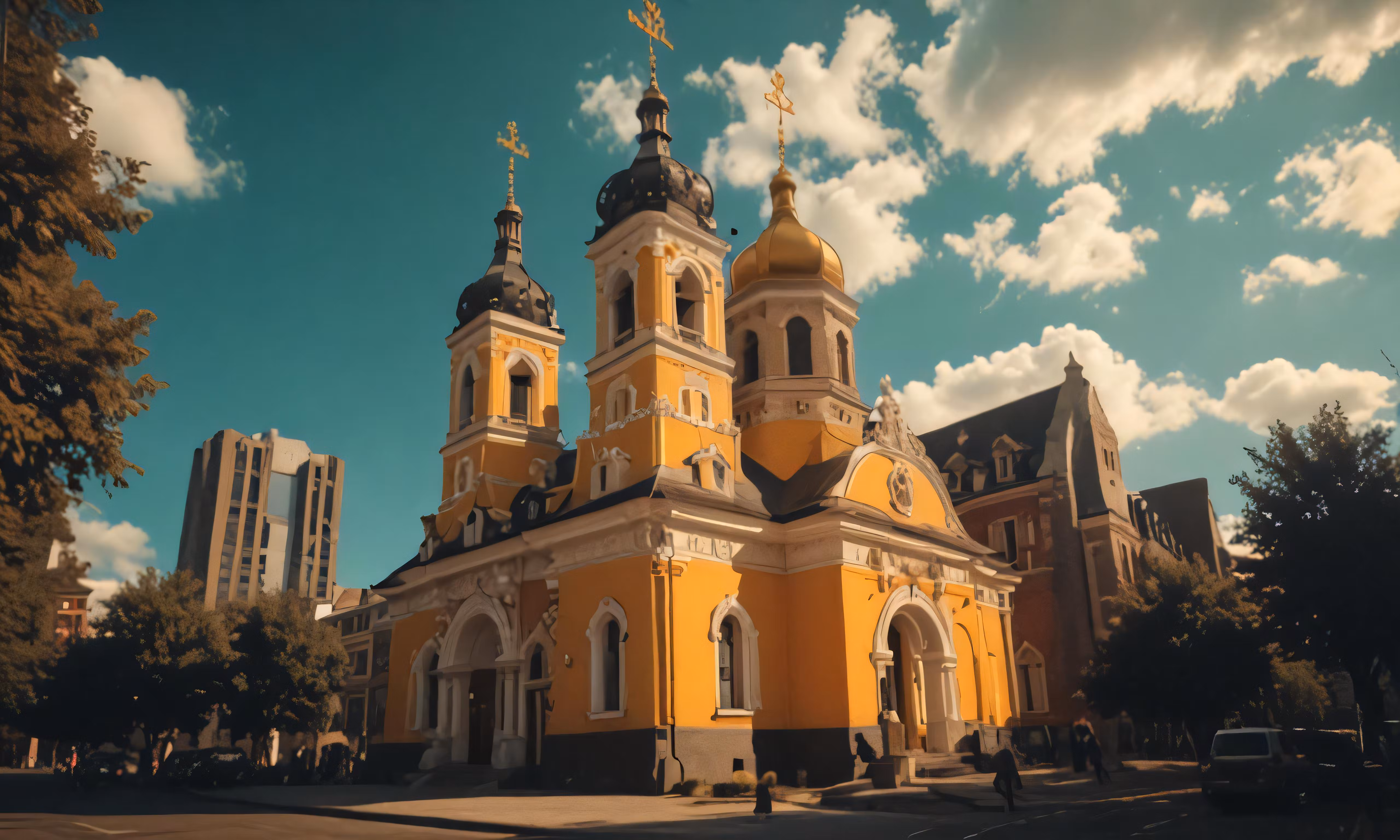 High resolution picture, free to use, yellow gothic church building on the corner with cloudy sky in background