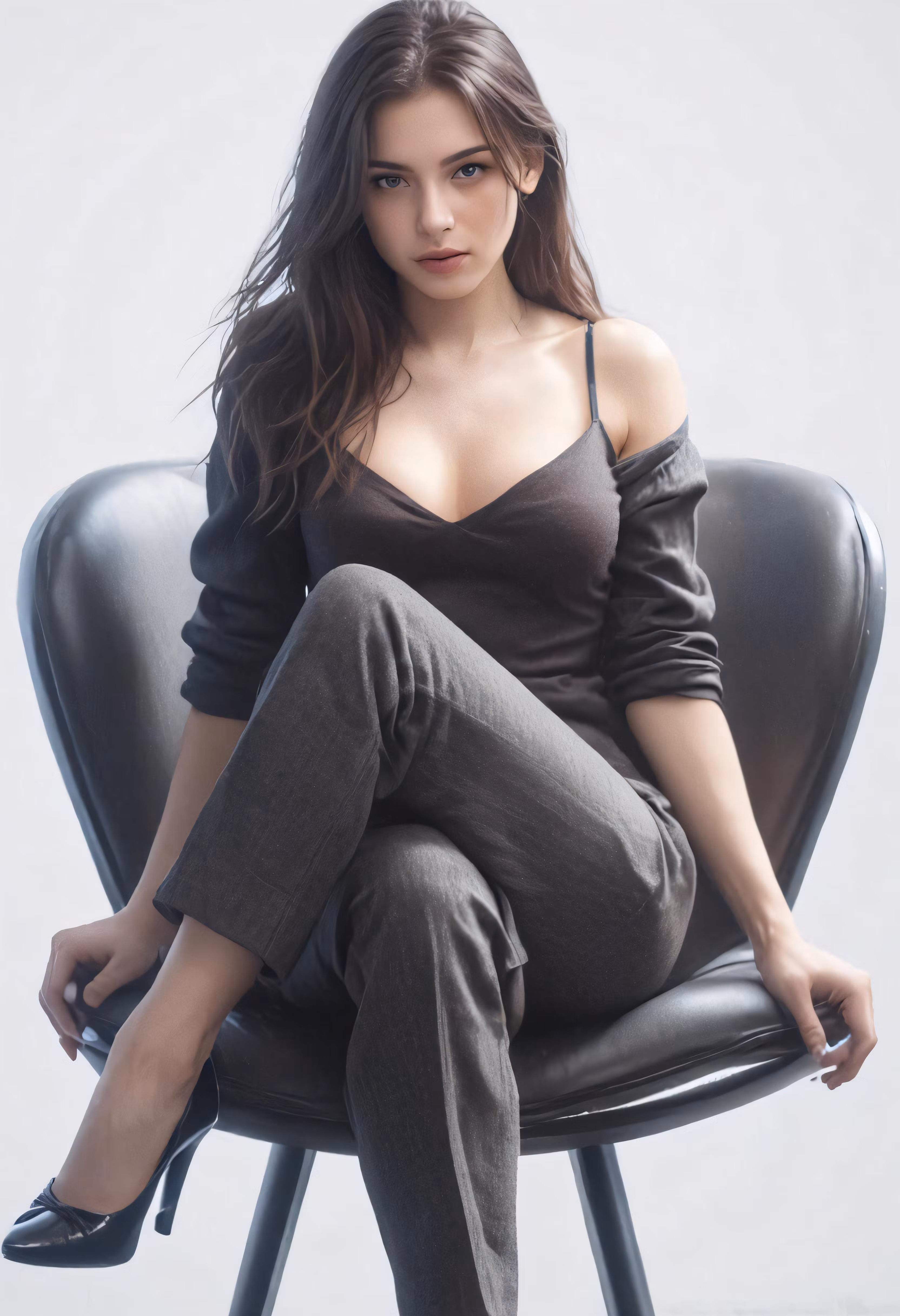 High resolution picture, free to use, young brunette lady sitting on grey chair posing for camera