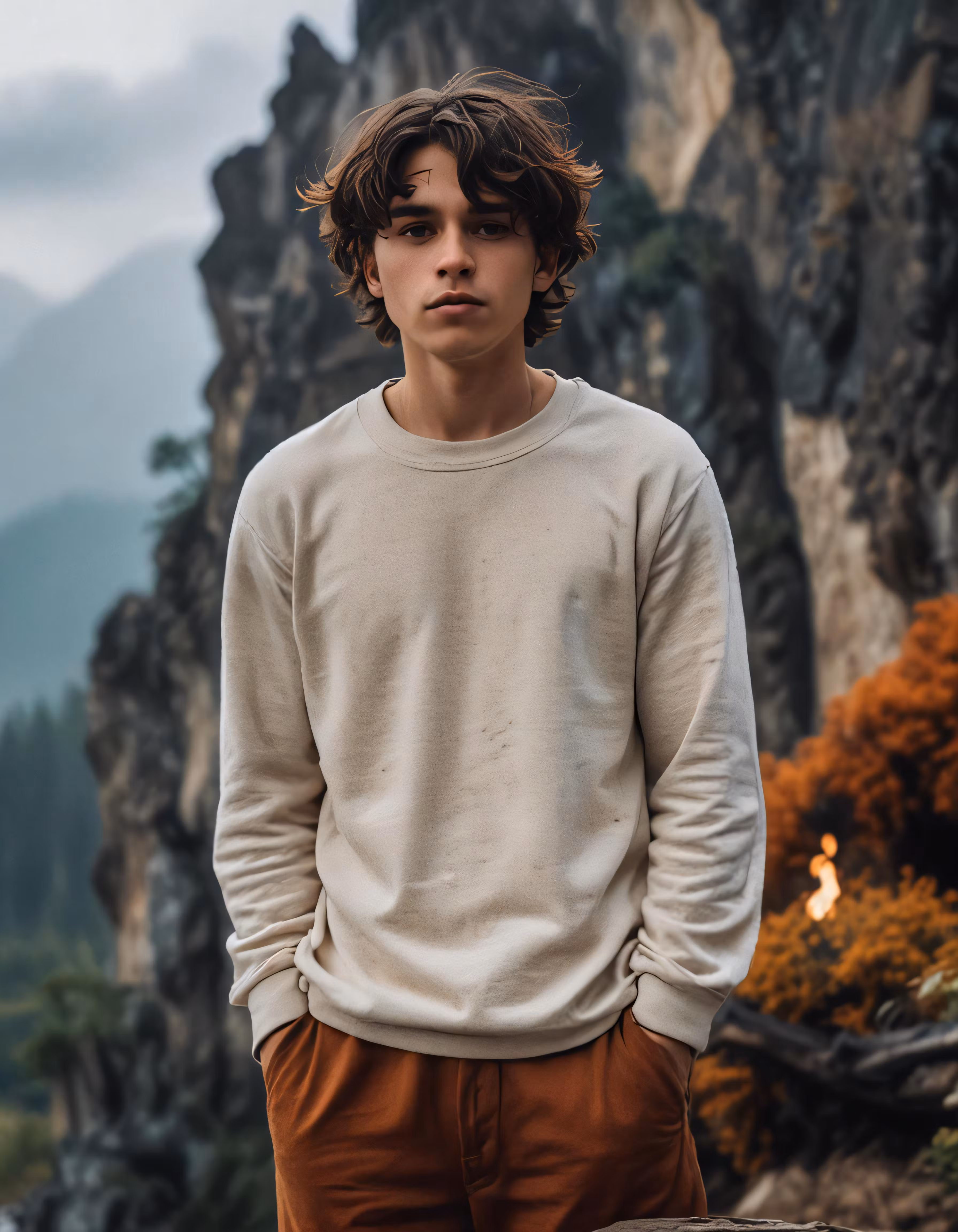 High resolution picture, free to use, young man in a sweater standing next to mountains
