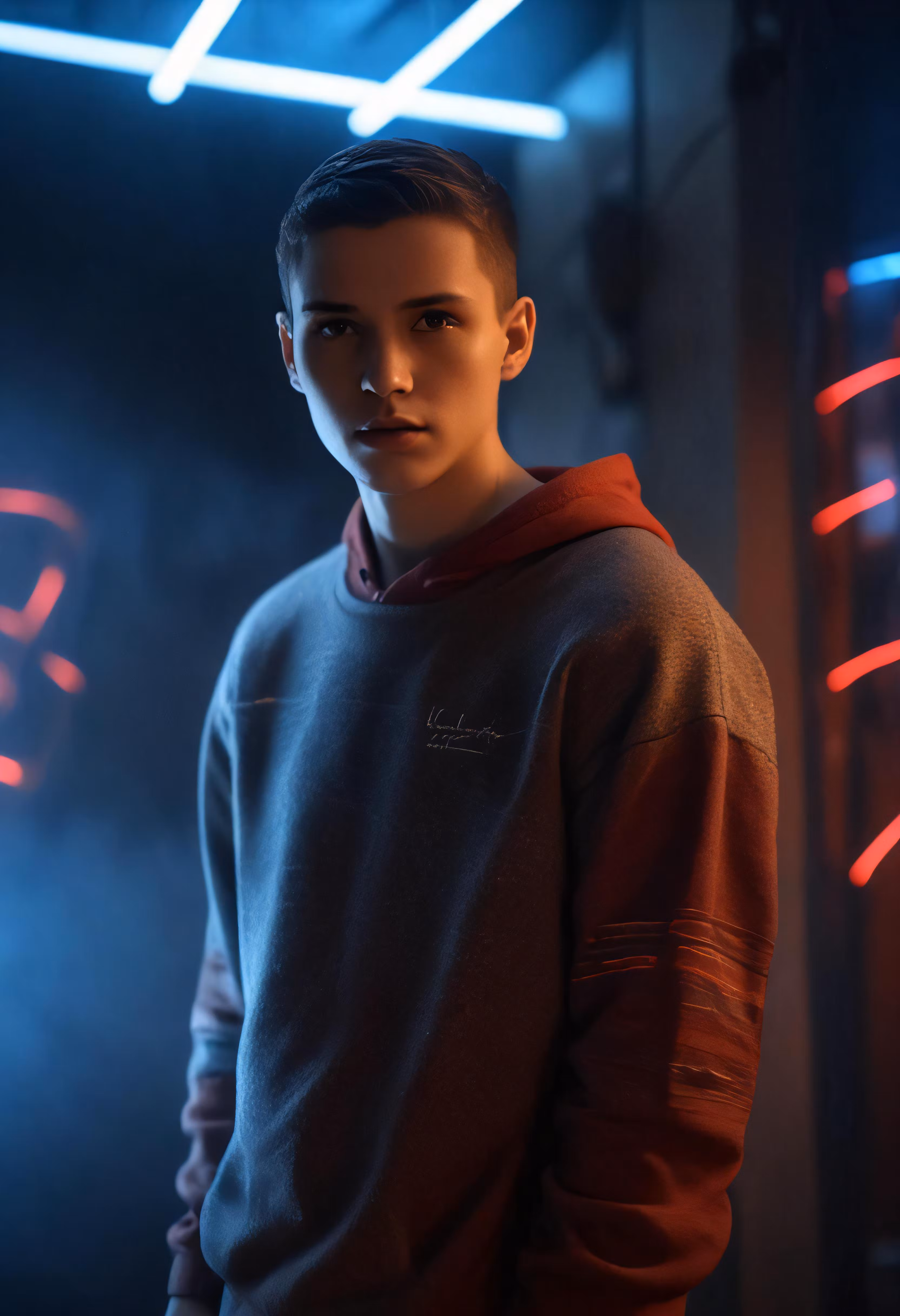High resolution picture, free to use, young man standing in front of neon lights