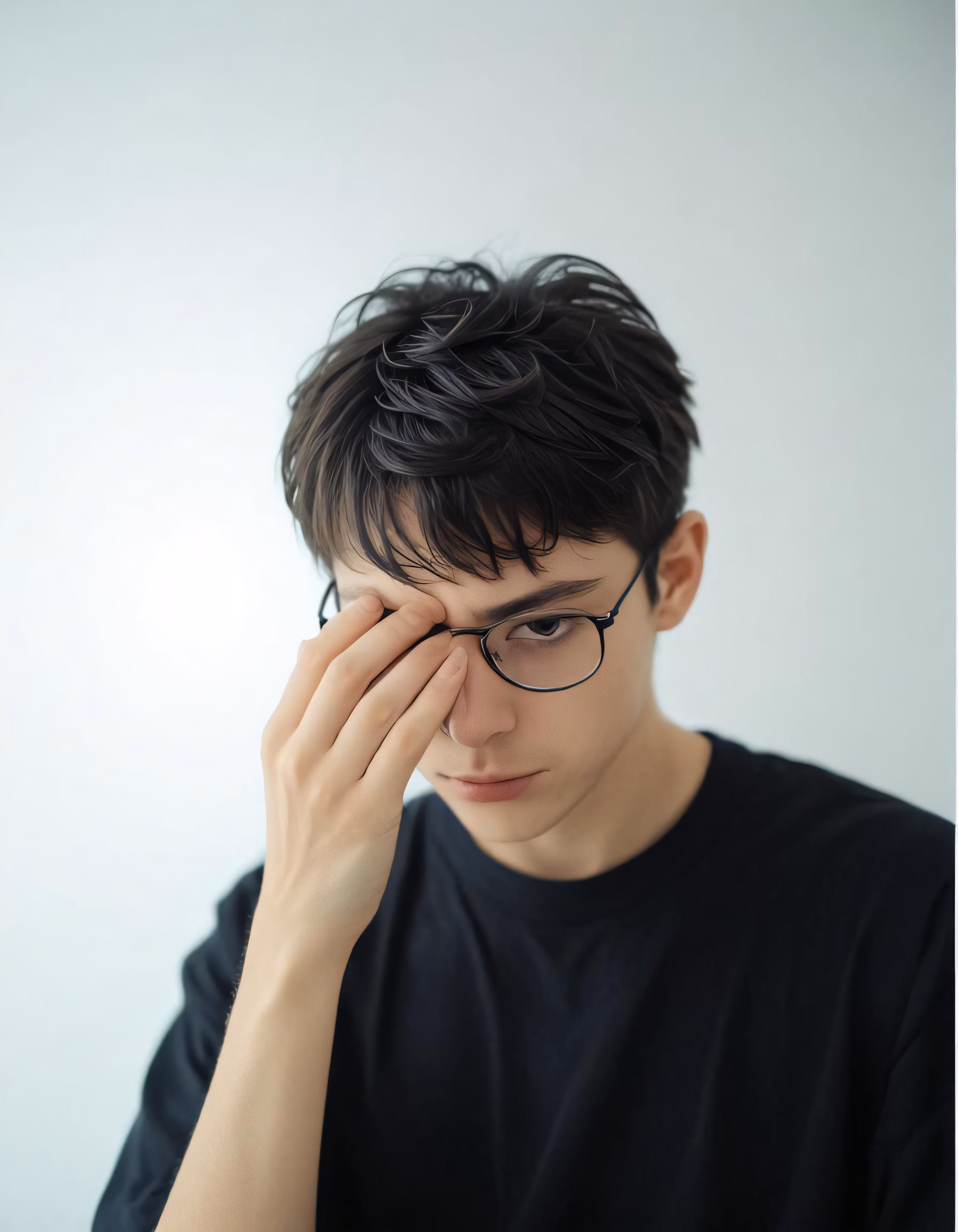 High resolution picture, free to use, young man wearing glasses covering his eyes with hand
