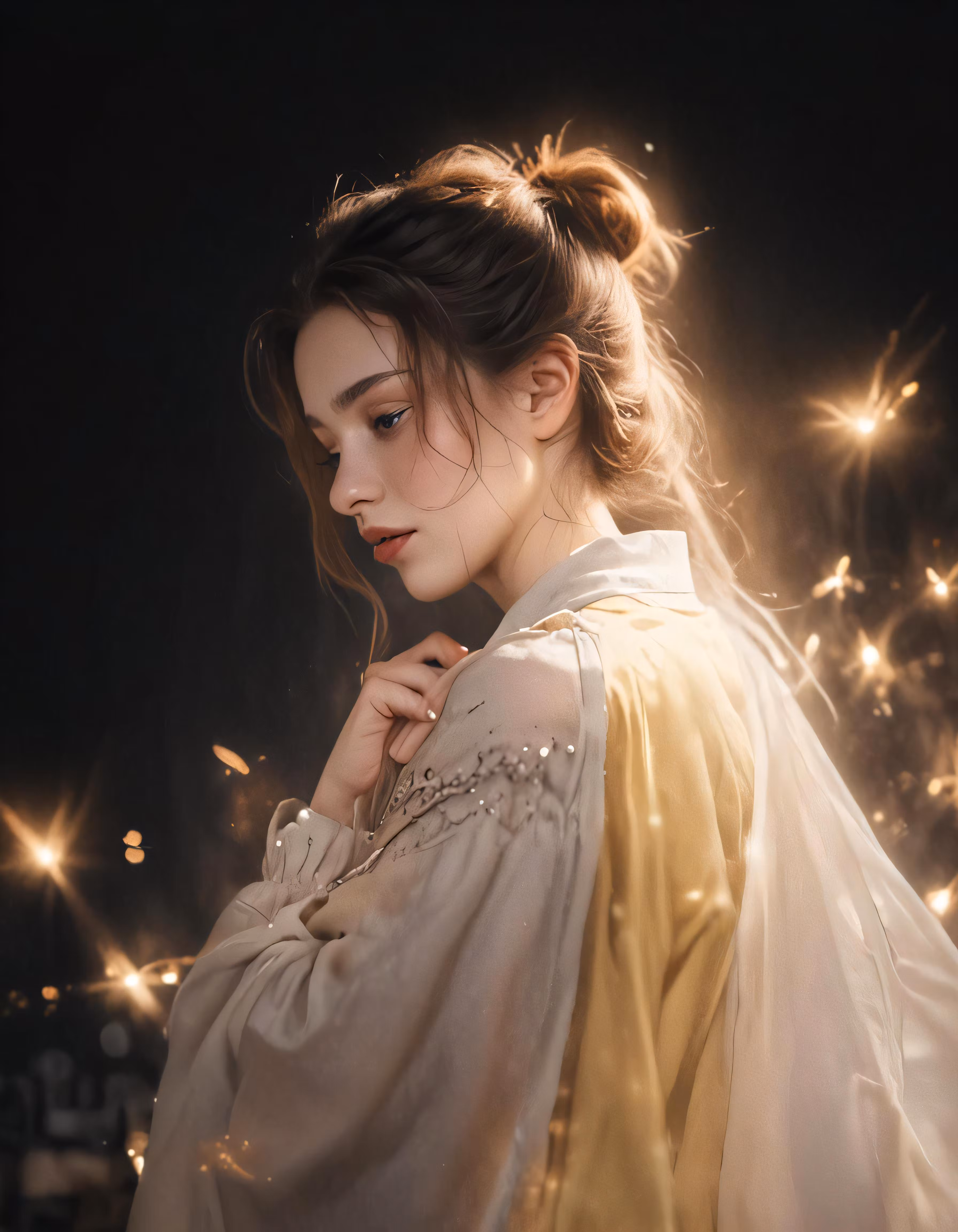 High resolution picture, free to use, young woman in dress and gold cape, gazing at star dust