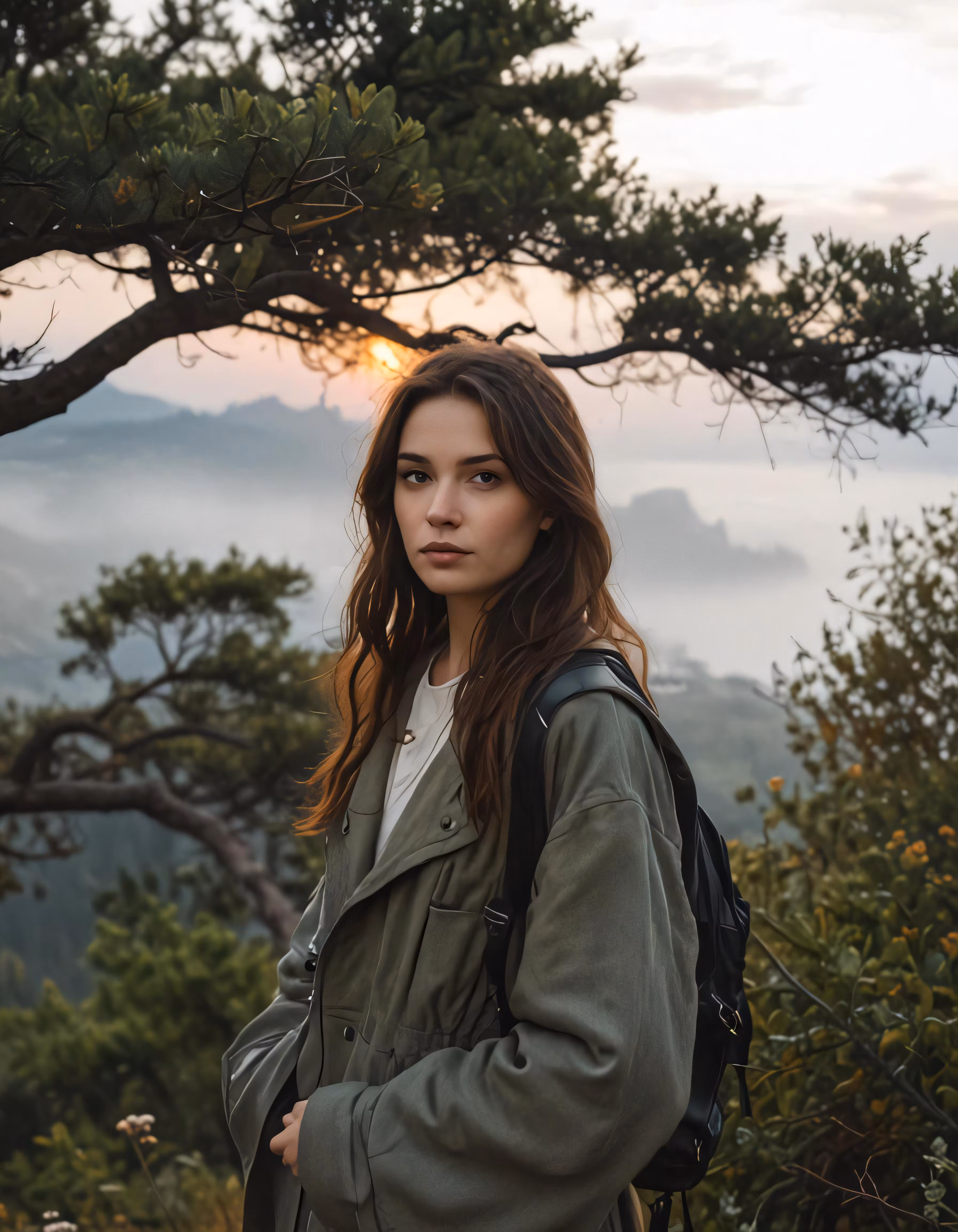 High resolution picture, free to use, young woman in trench coat looking over shoulder at sunset