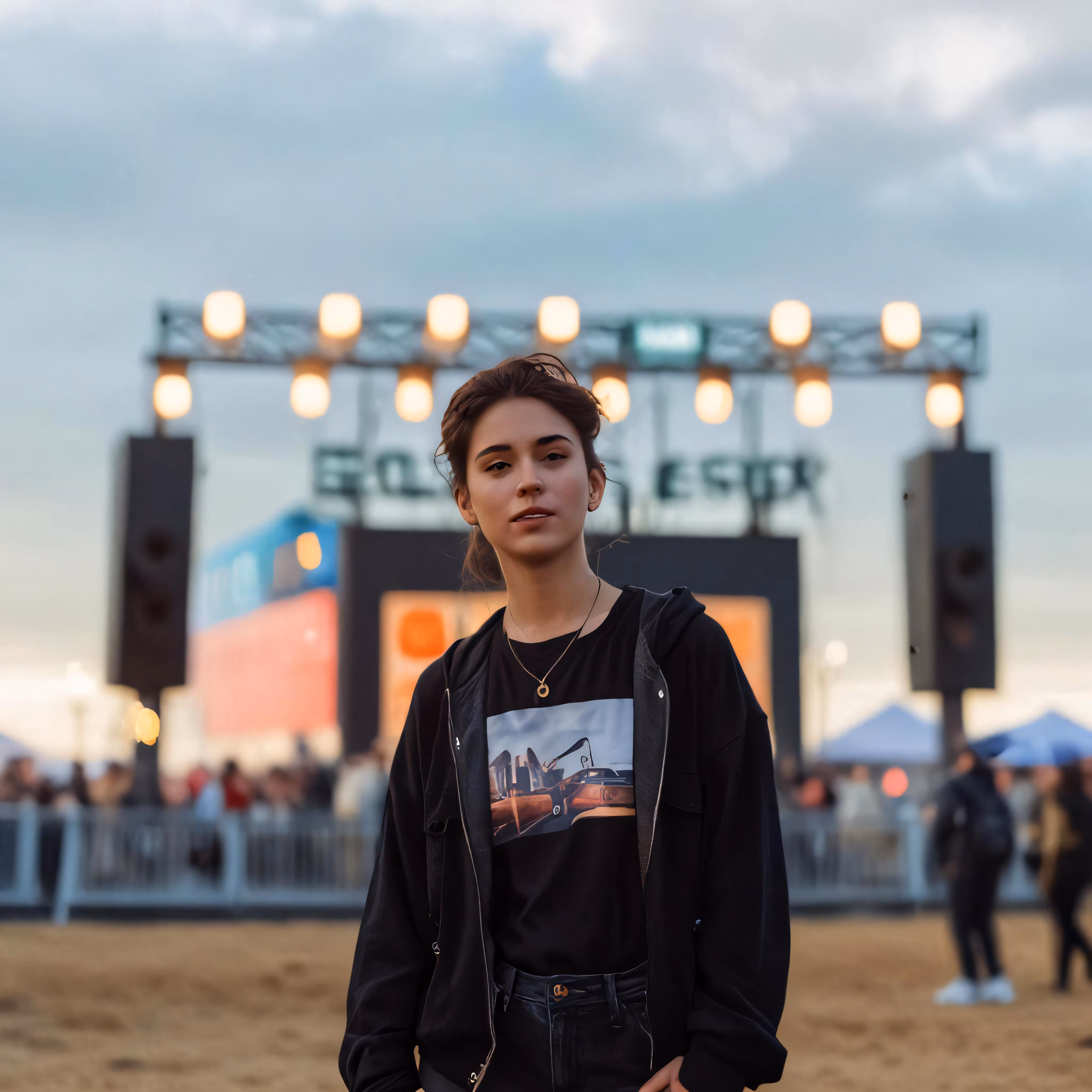 High resolution picture, free to use, young woman standing in dirt with many lights