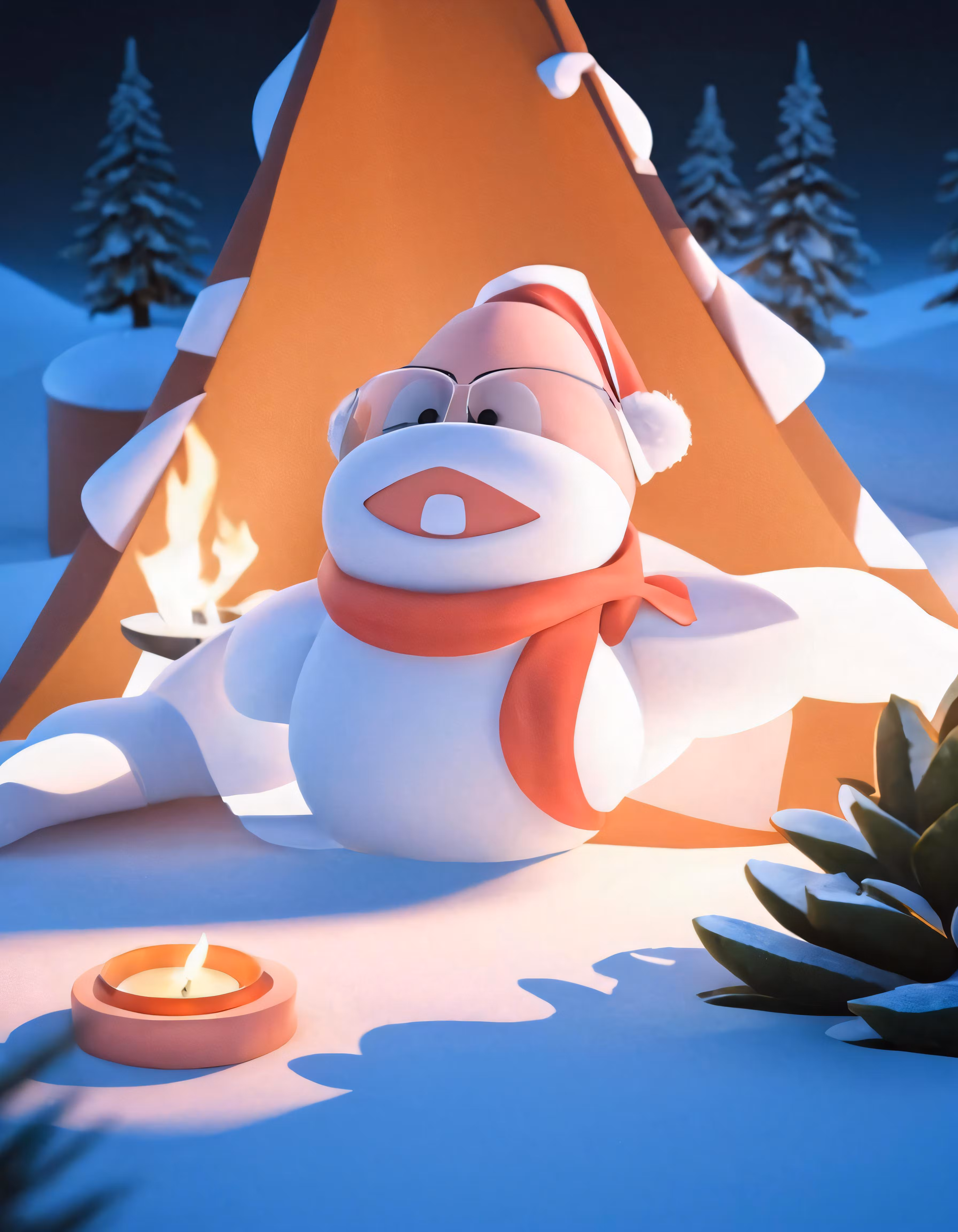 High resolution picture, free to use, a 3d christmas scene with a snowman and fire