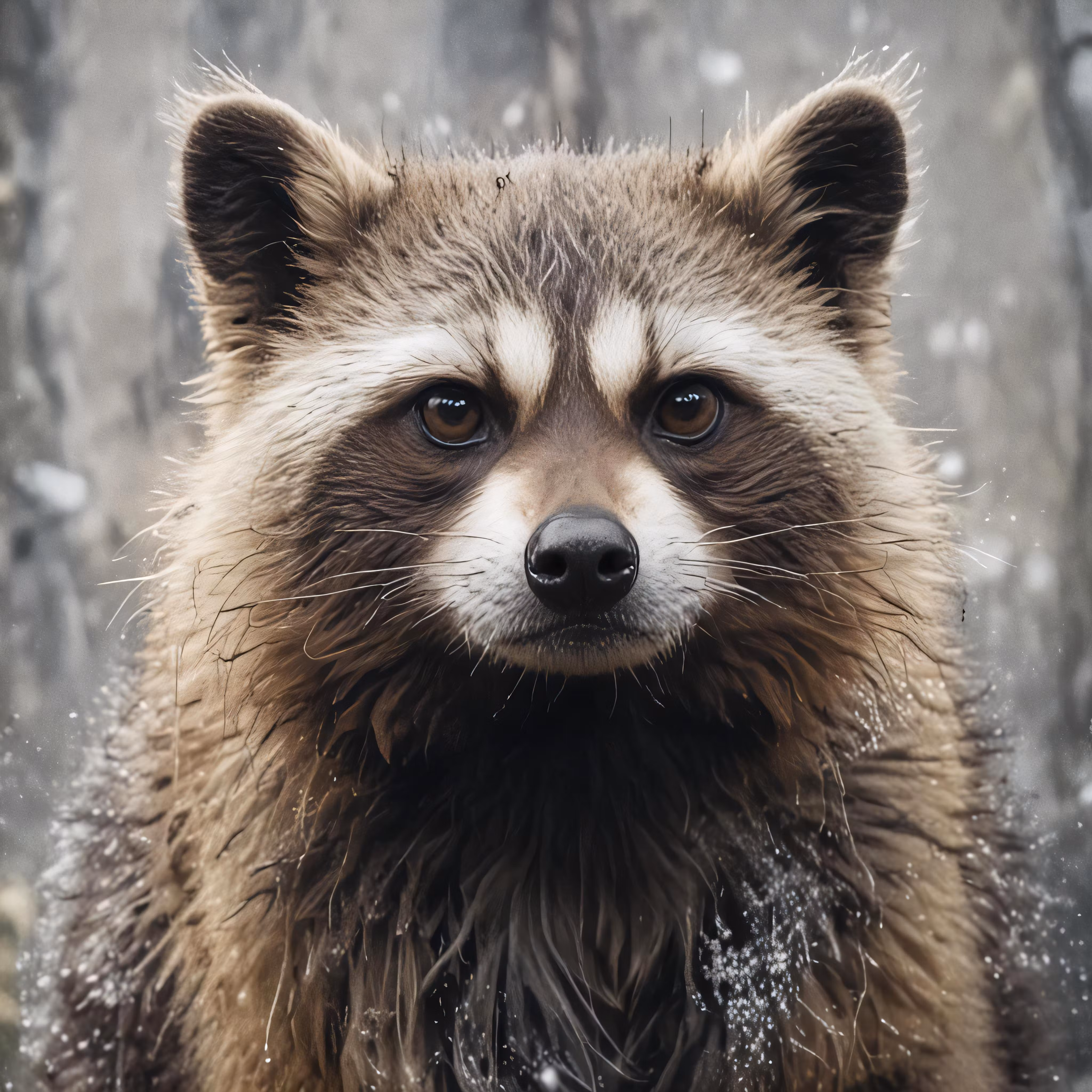 High resolution picture, free to use, a baby racoon in the snow looks off to the right