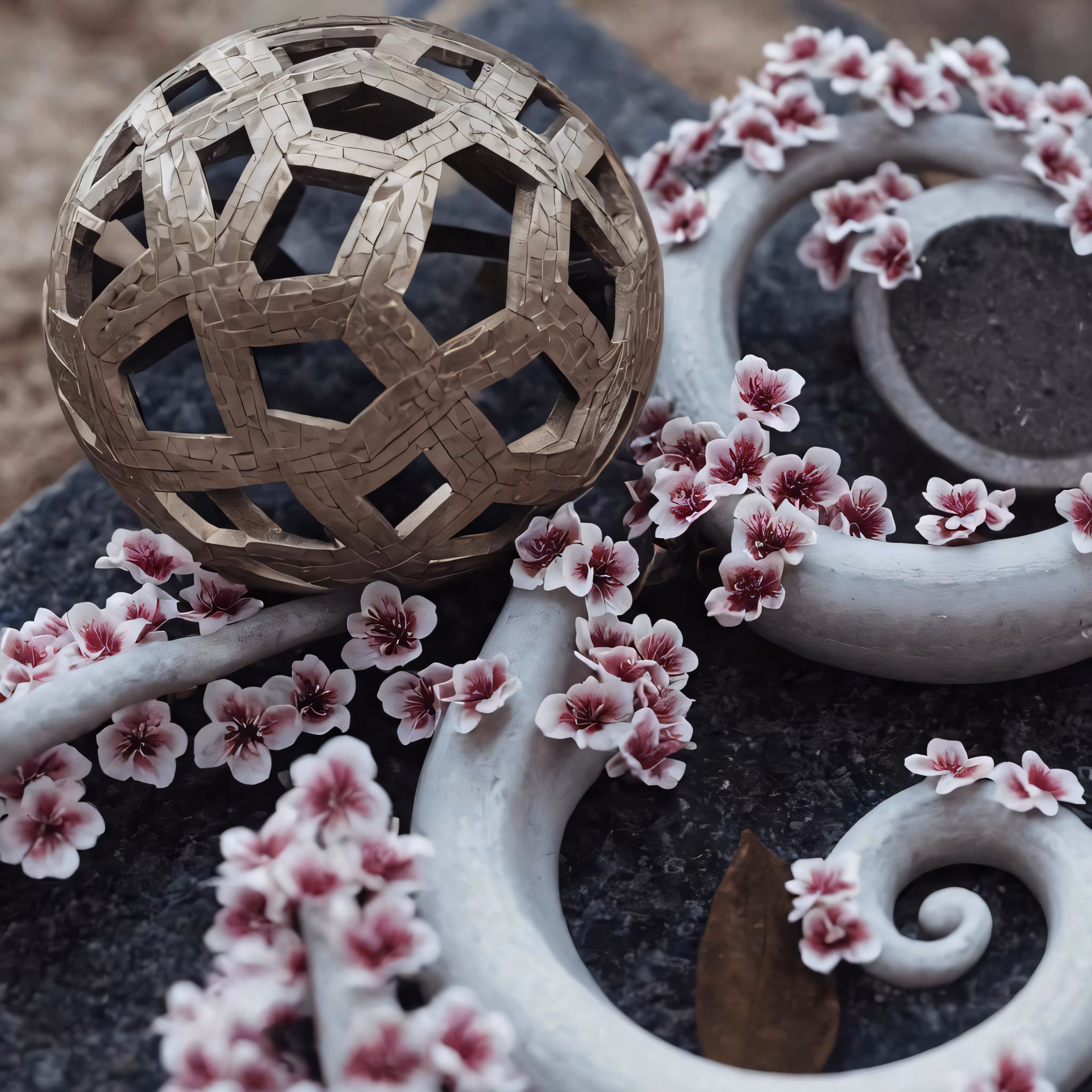 High resolution picture, free to use, a ball and some flowers sitting on a granite