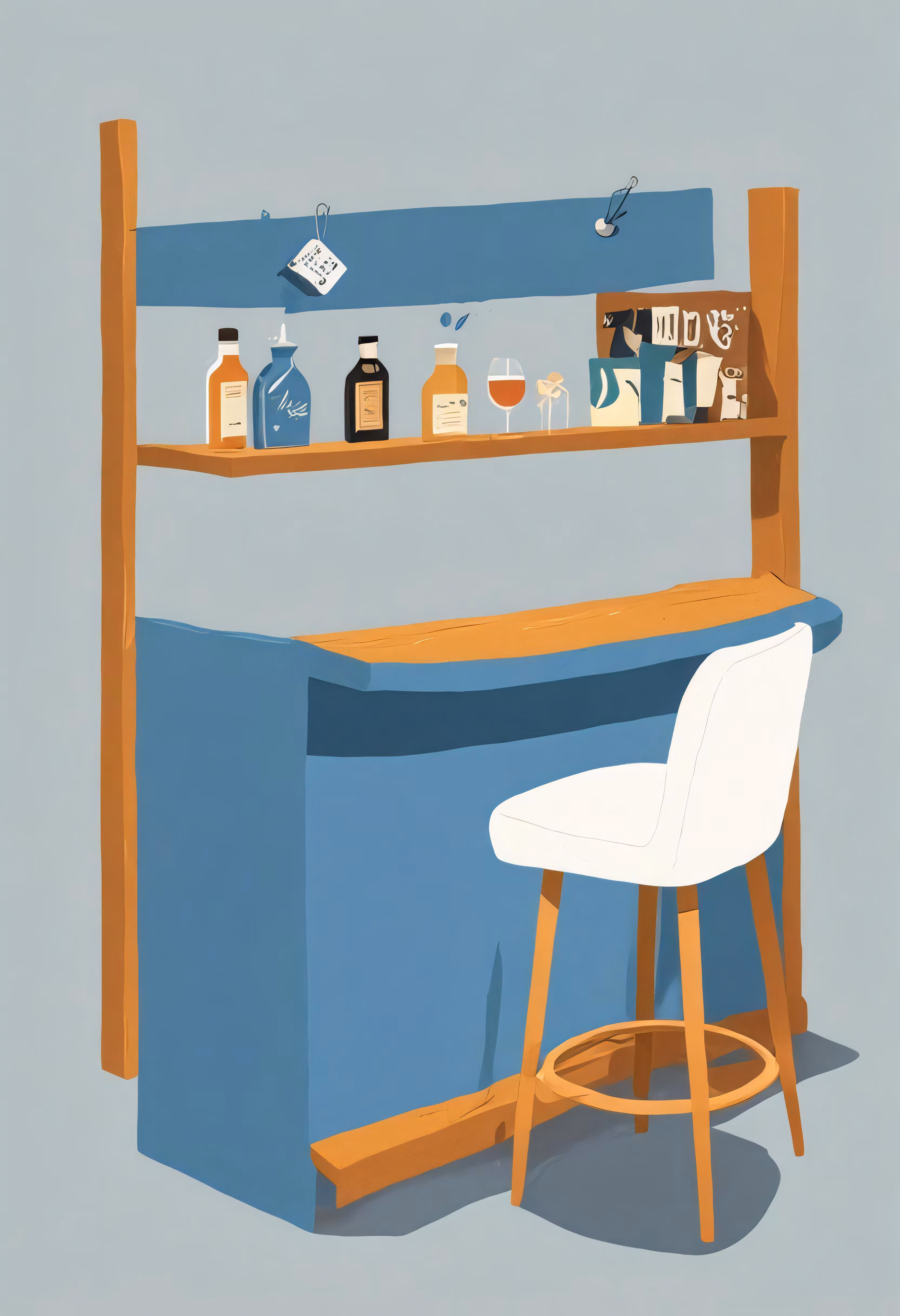 High resolution picture, free to use, a bar with a stool, bottles and an empty glass