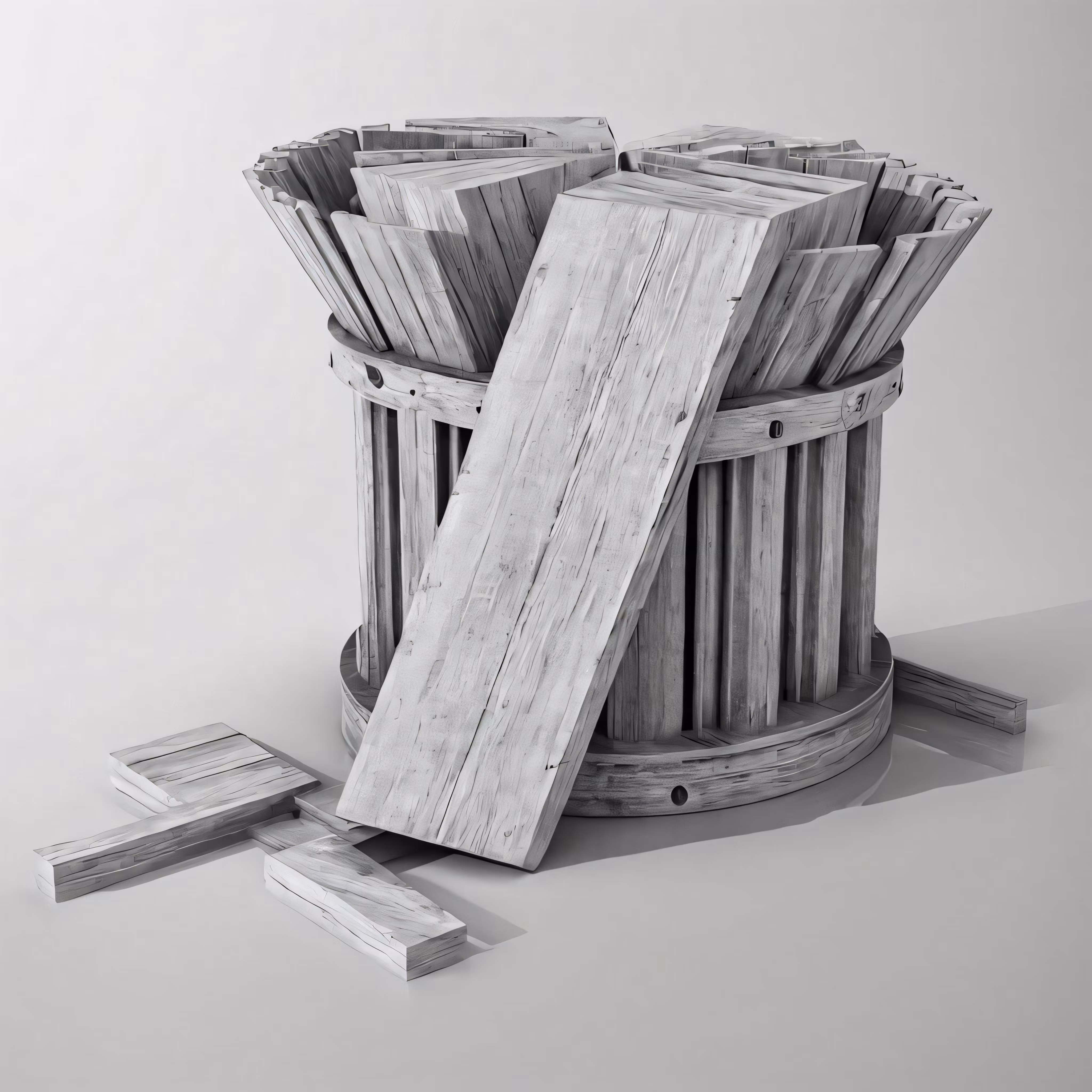 High resolution picture, free to use, a barrel with wooden planks inside it, and pieces out of the basket