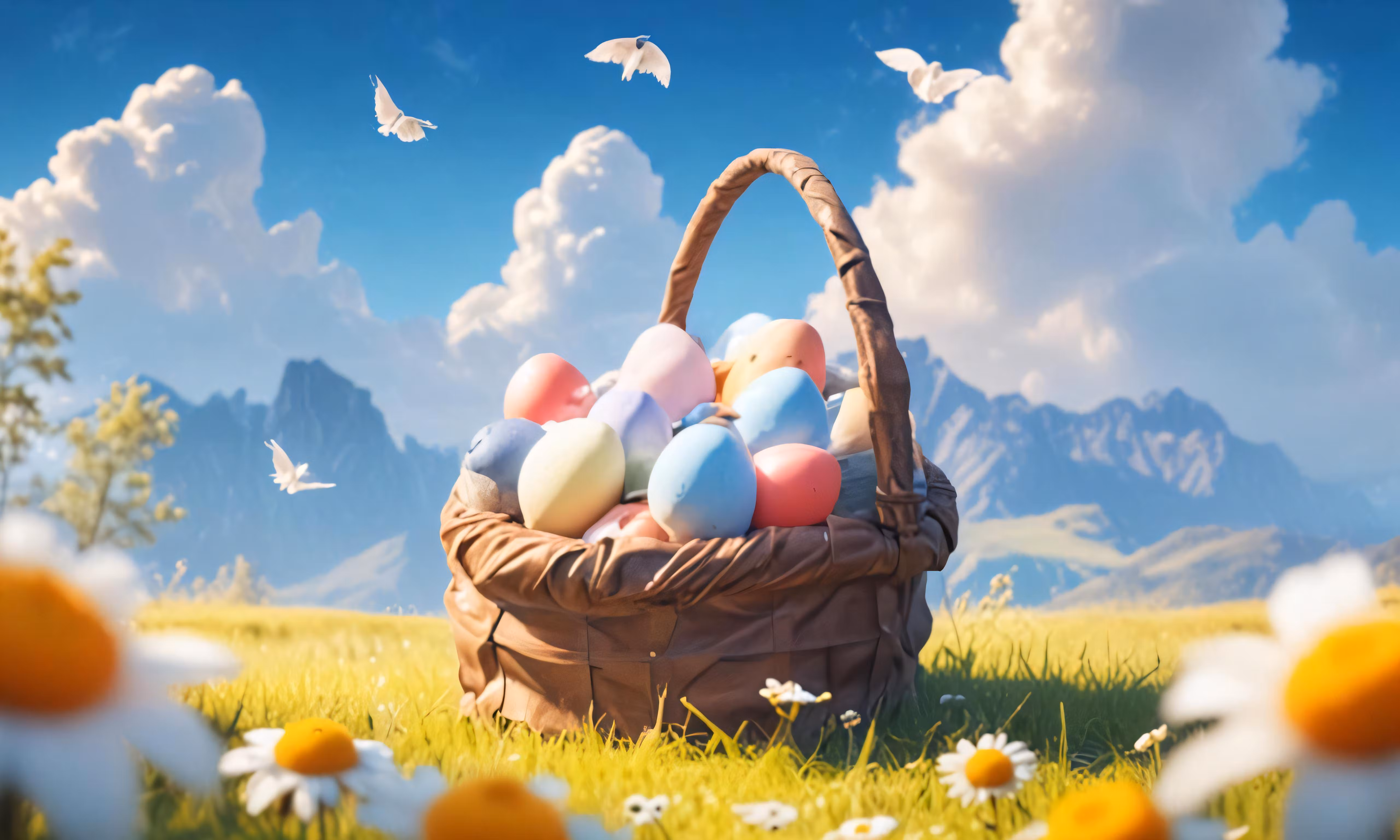 High resolution picture, free to use, a basket with many colorful eggs is near some daisies