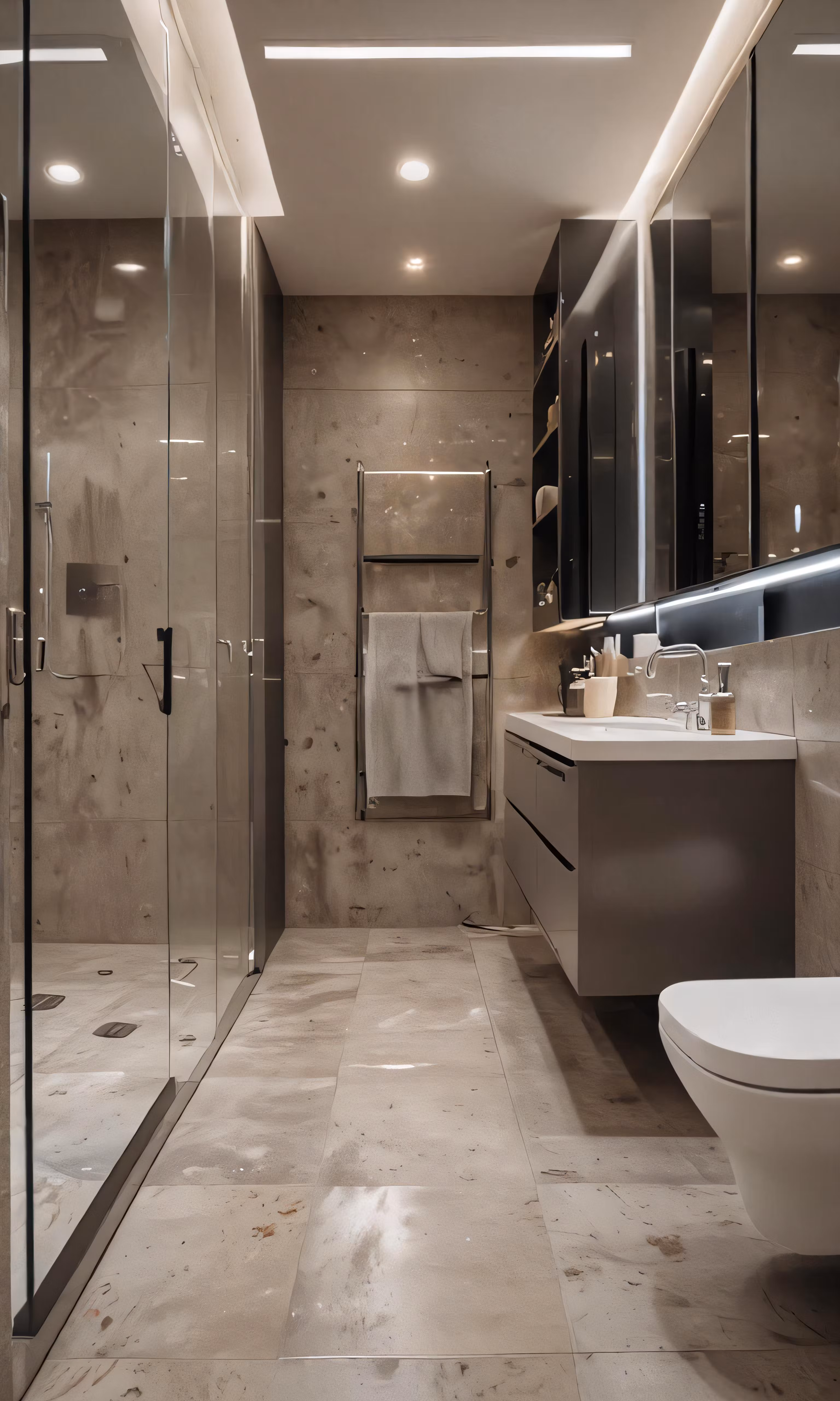High resolution picture, free to use, a bathroom is shown with toilet, shower and sink