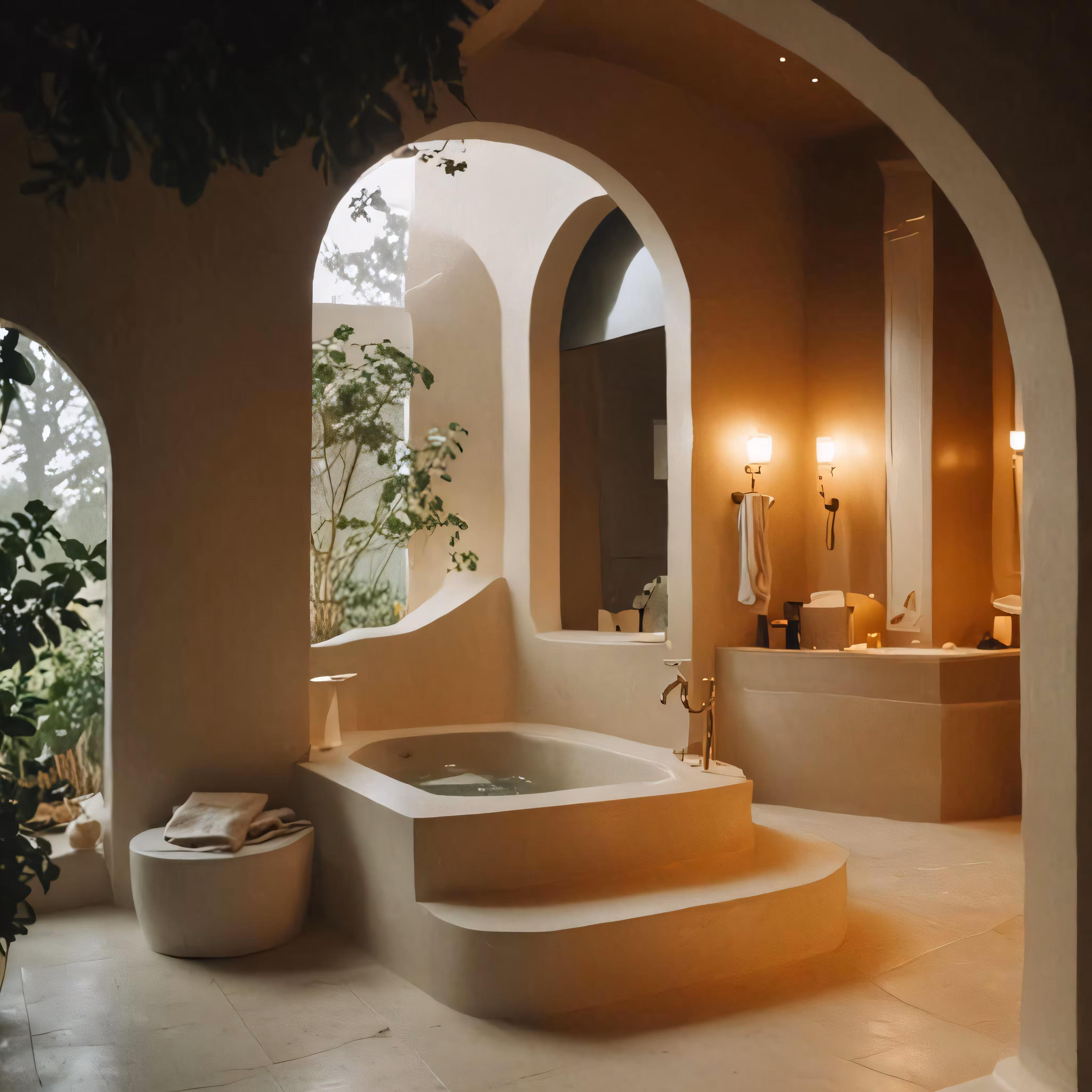 High resolution picture, free to use, a bathroom with stairs, and a large tub