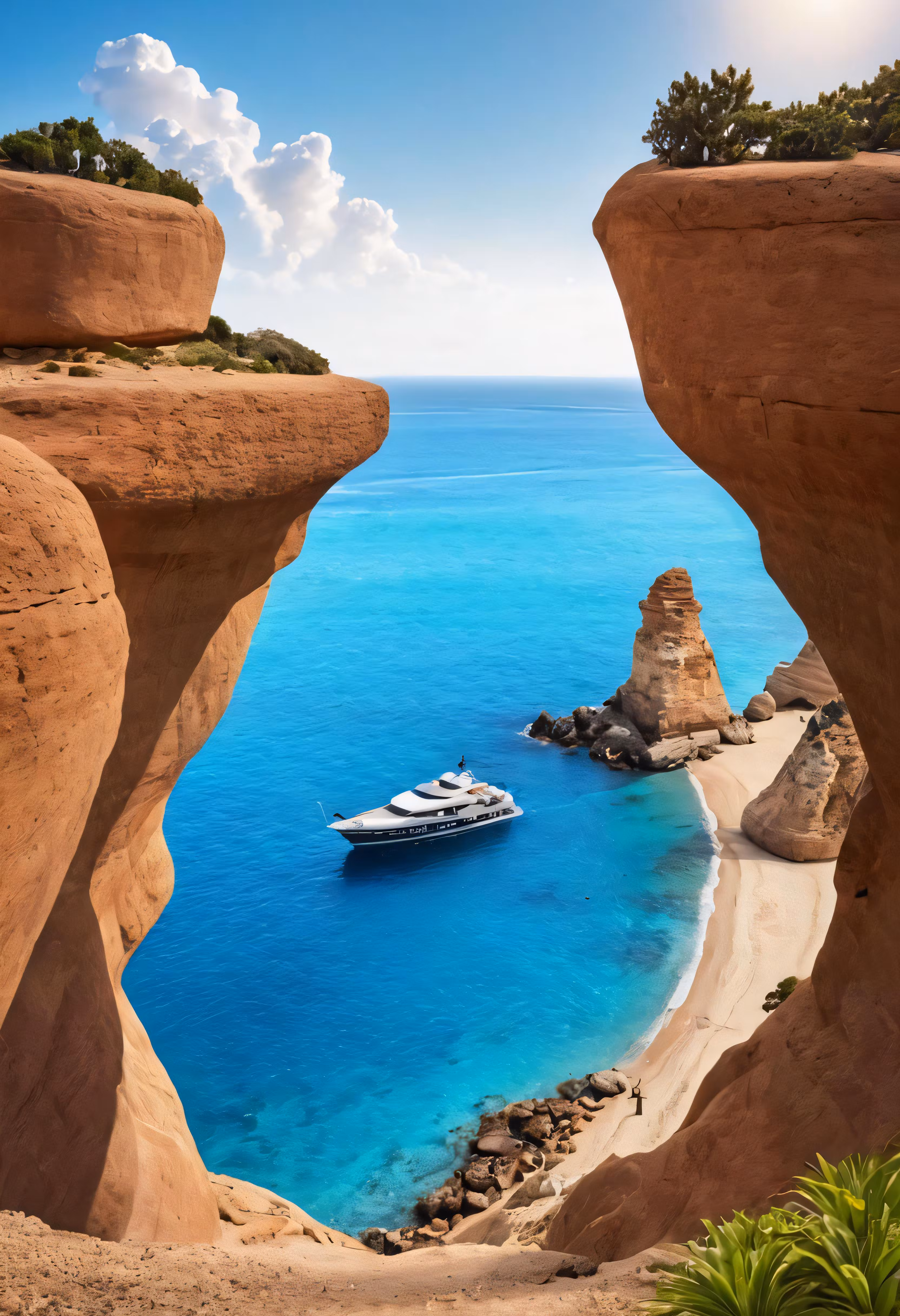 High resolution picture, free to use, a beach and boat in the ocean, viewed through an arch
