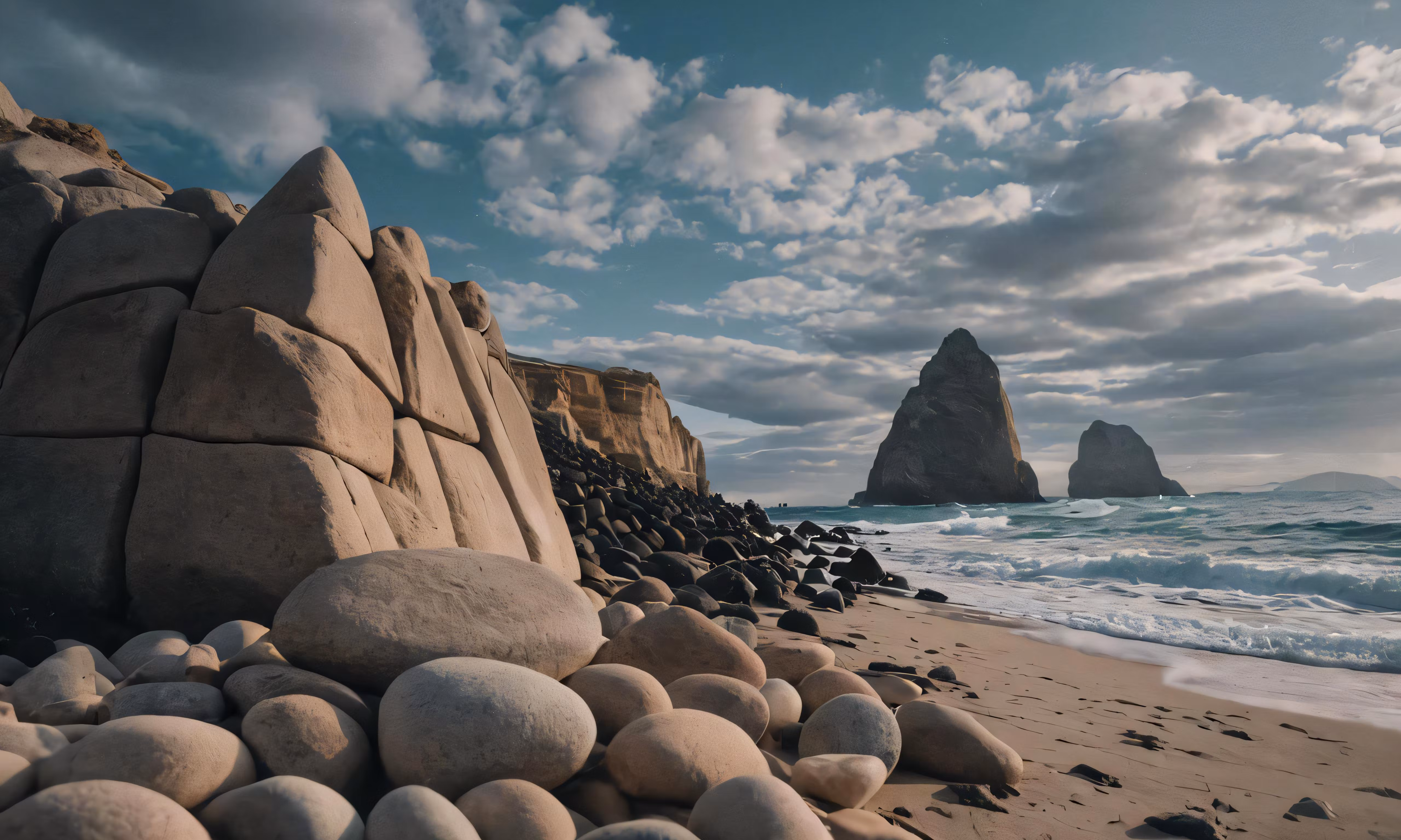 High resolution picture, free to use, a beach near some rocks and water under a cloudy sky