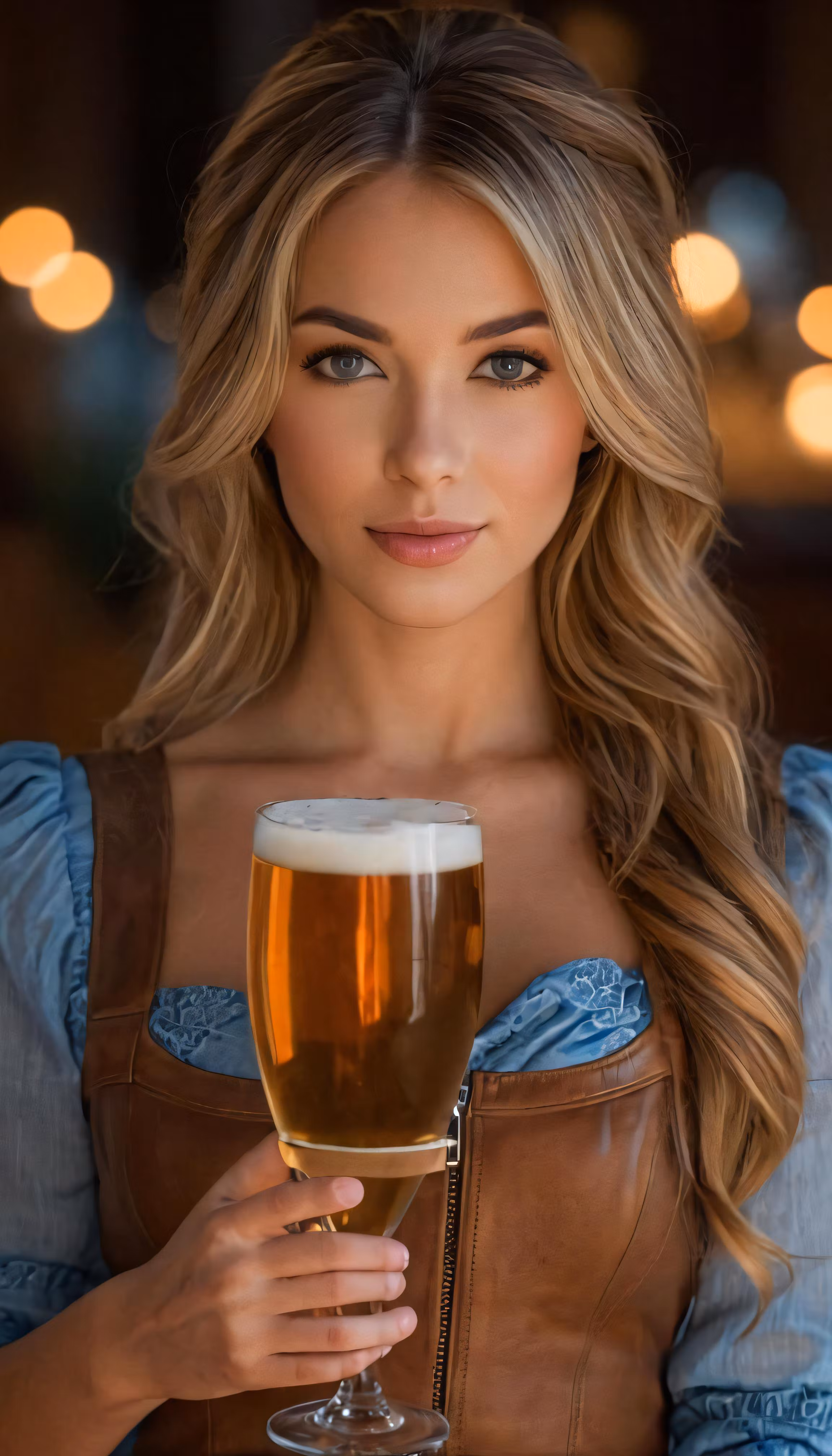 High resolution picture, free to use, a beautiful blond girl dressed in an apron with blonde hair holds a glass of beer