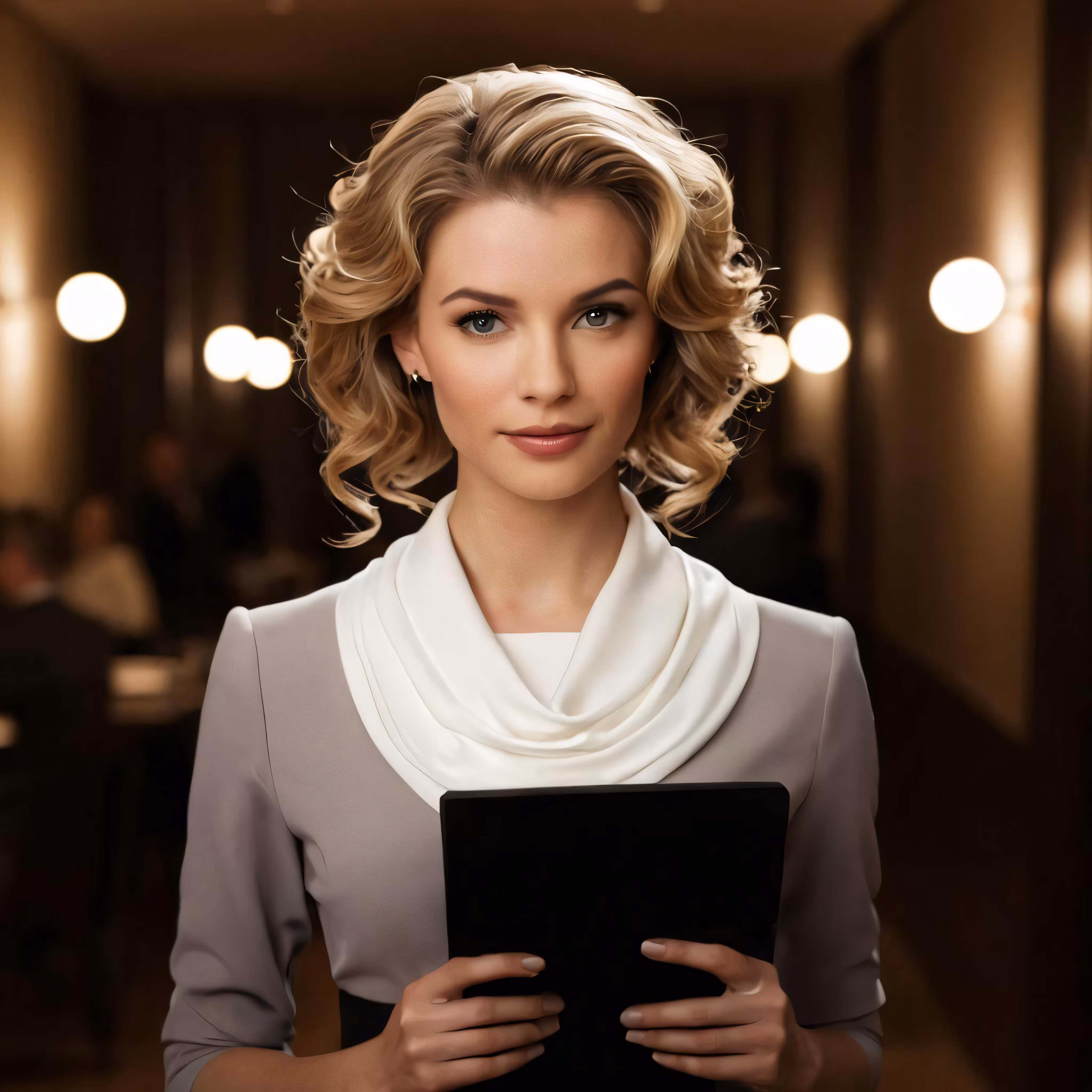 High resolution picture, free to use, a beautiful blond woman holding a black tablet