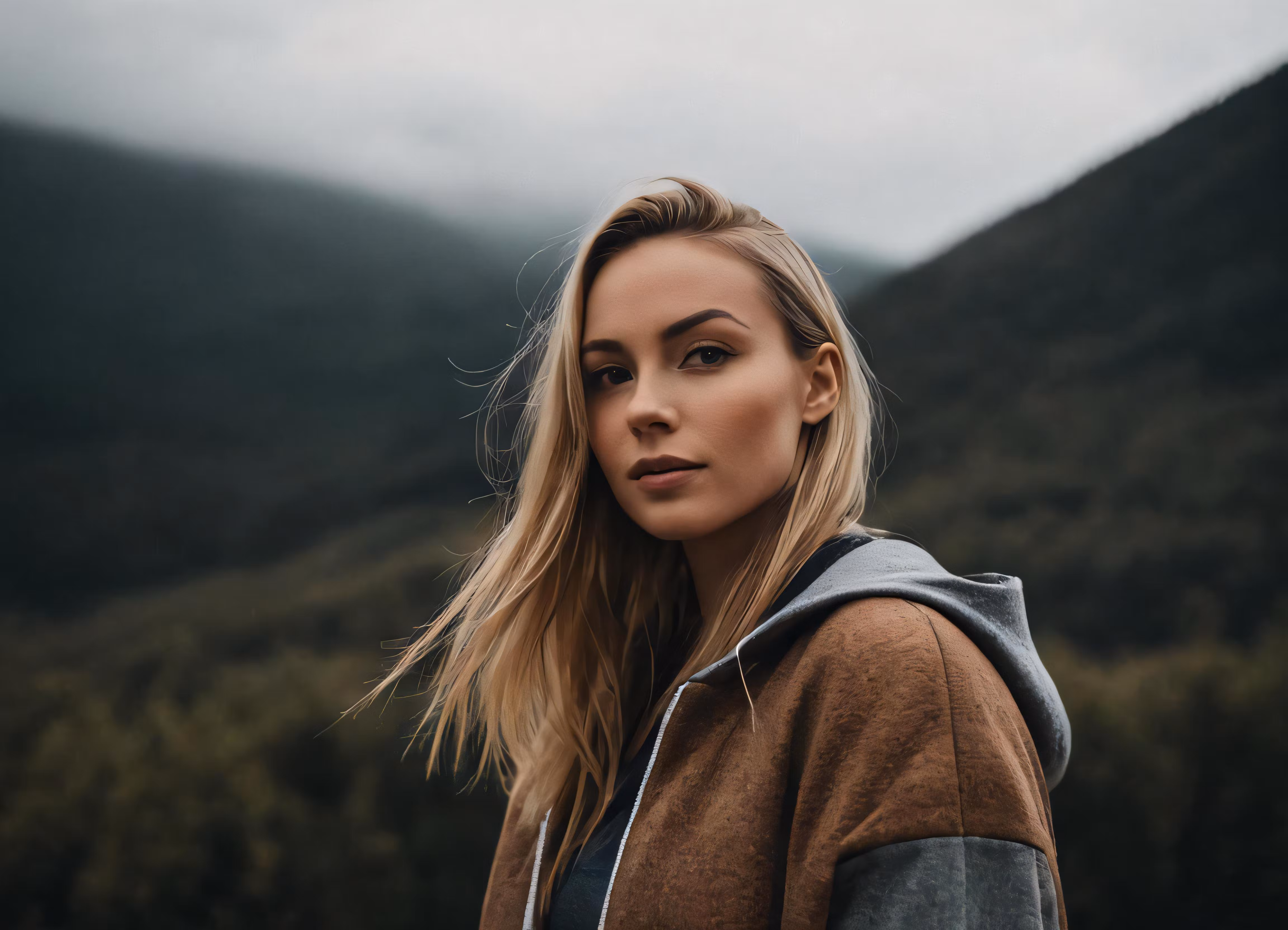 High resolution picture, free to use, a beautiful blond woman posing for the camera in front of a mountain