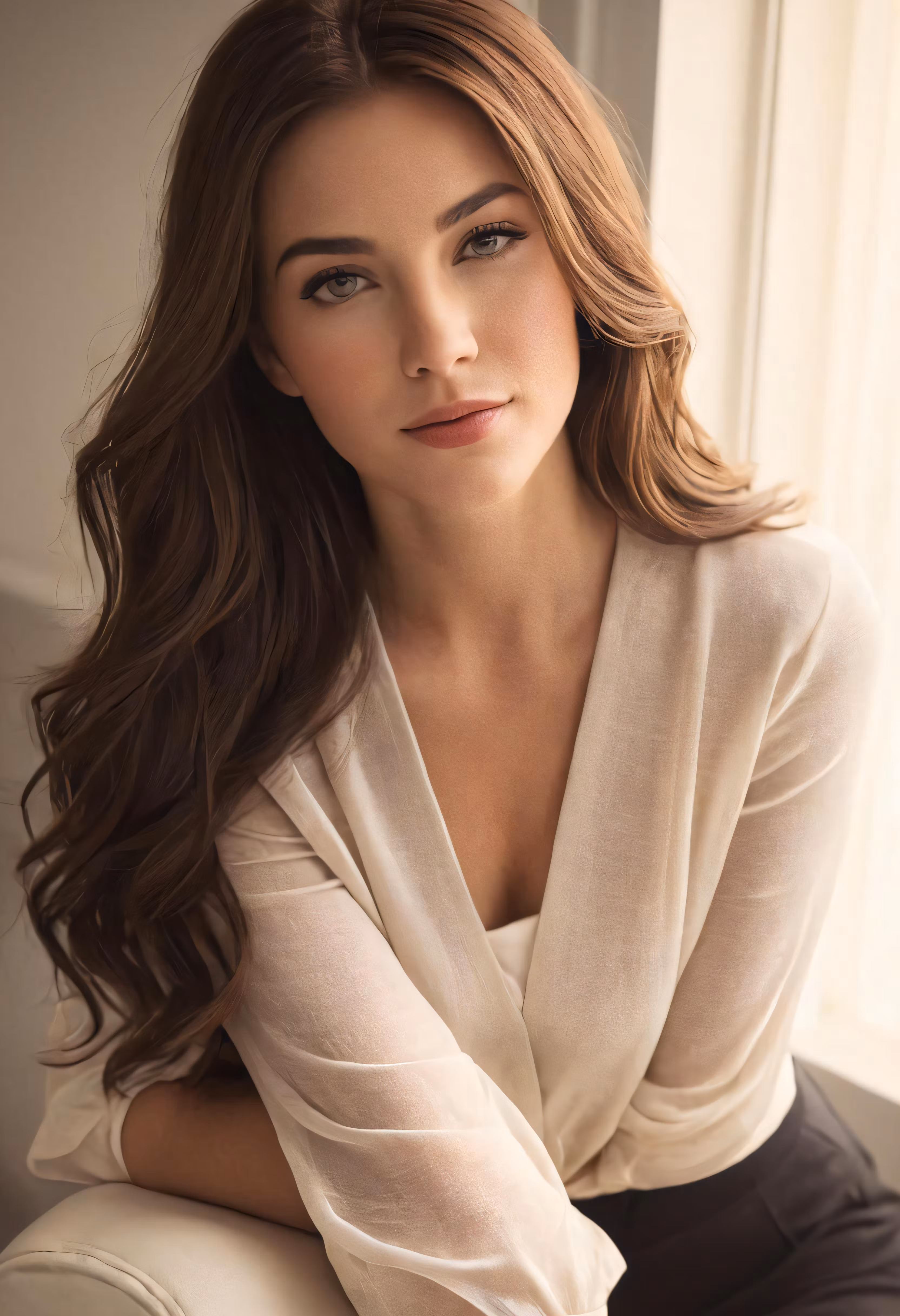 High resolution picture, free to use, a beautiful lady with very long hair sitting on a chair