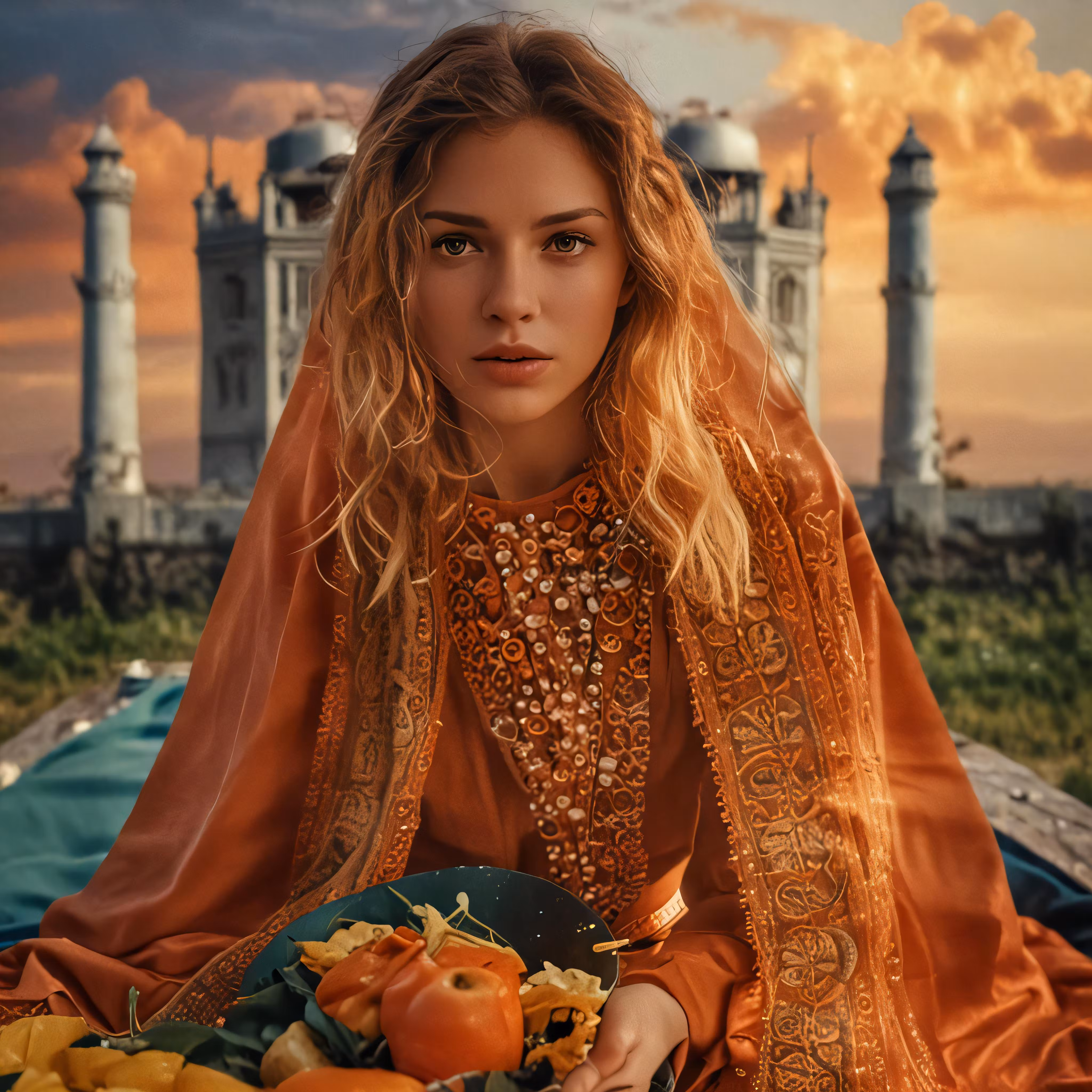 High resolution picture, free to use, a beautiful woman in a gold outfit and orange scarf sitting with tomatoes