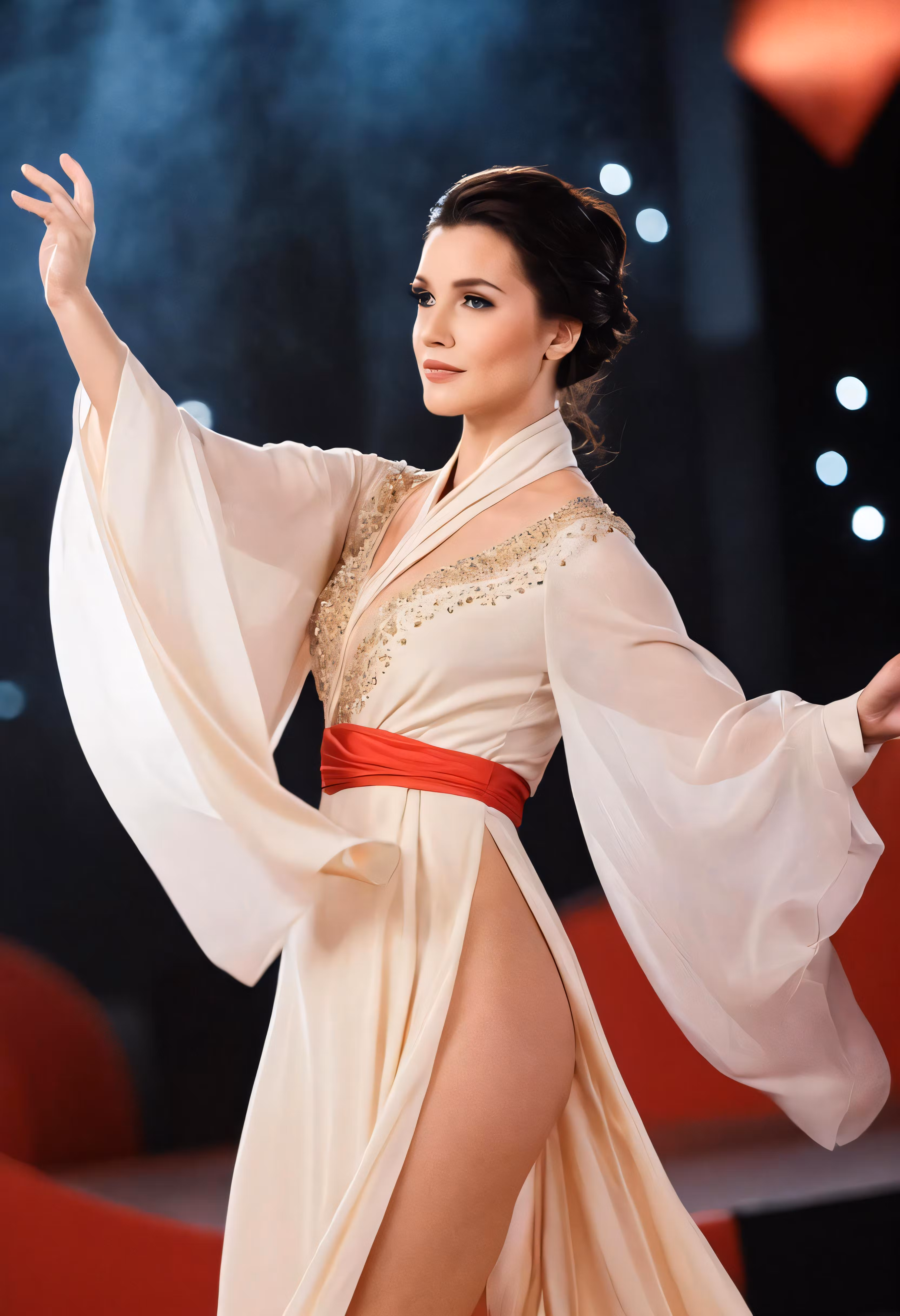 High resolution picture, free to use, a beautiful woman in a long dress is doing a belly dance