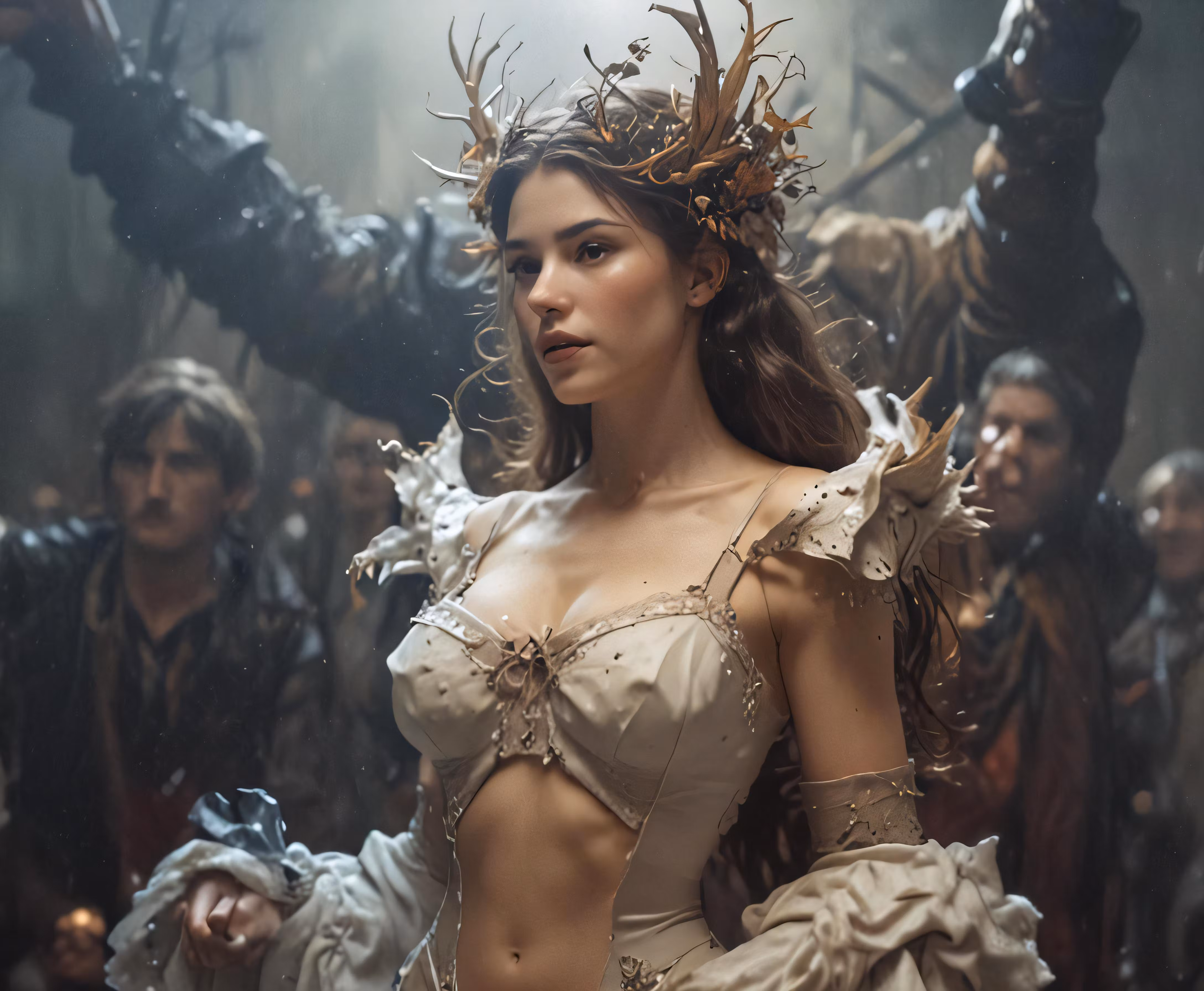 High resolution picture, free to use, a beautiful woman in a white dress surrounded by men