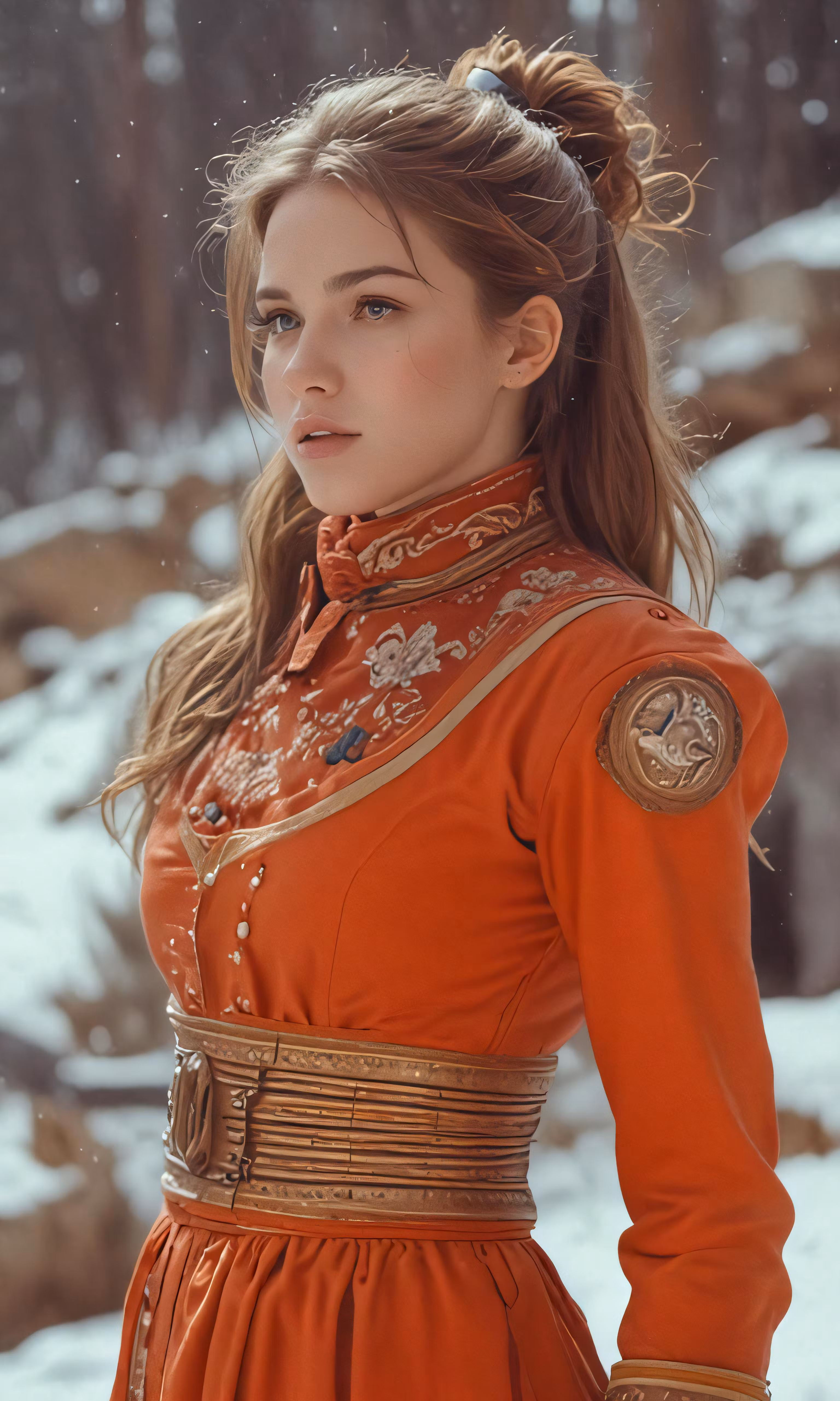 High resolution picture, free to use, a beautiful woman in an orange outfit is wearing red