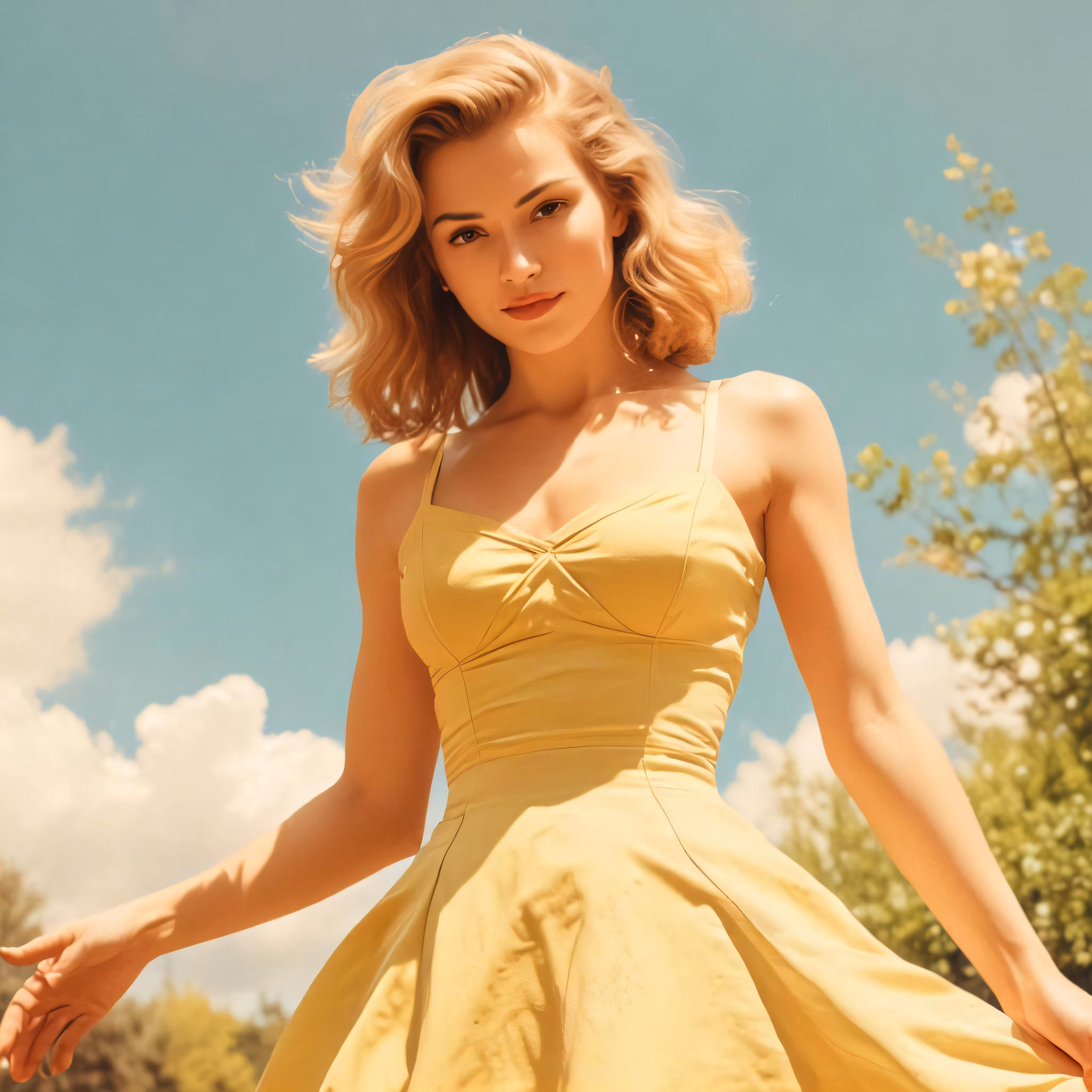 High resolution picture, free to use, a beautiful woman posing for a photo in a yellow dress