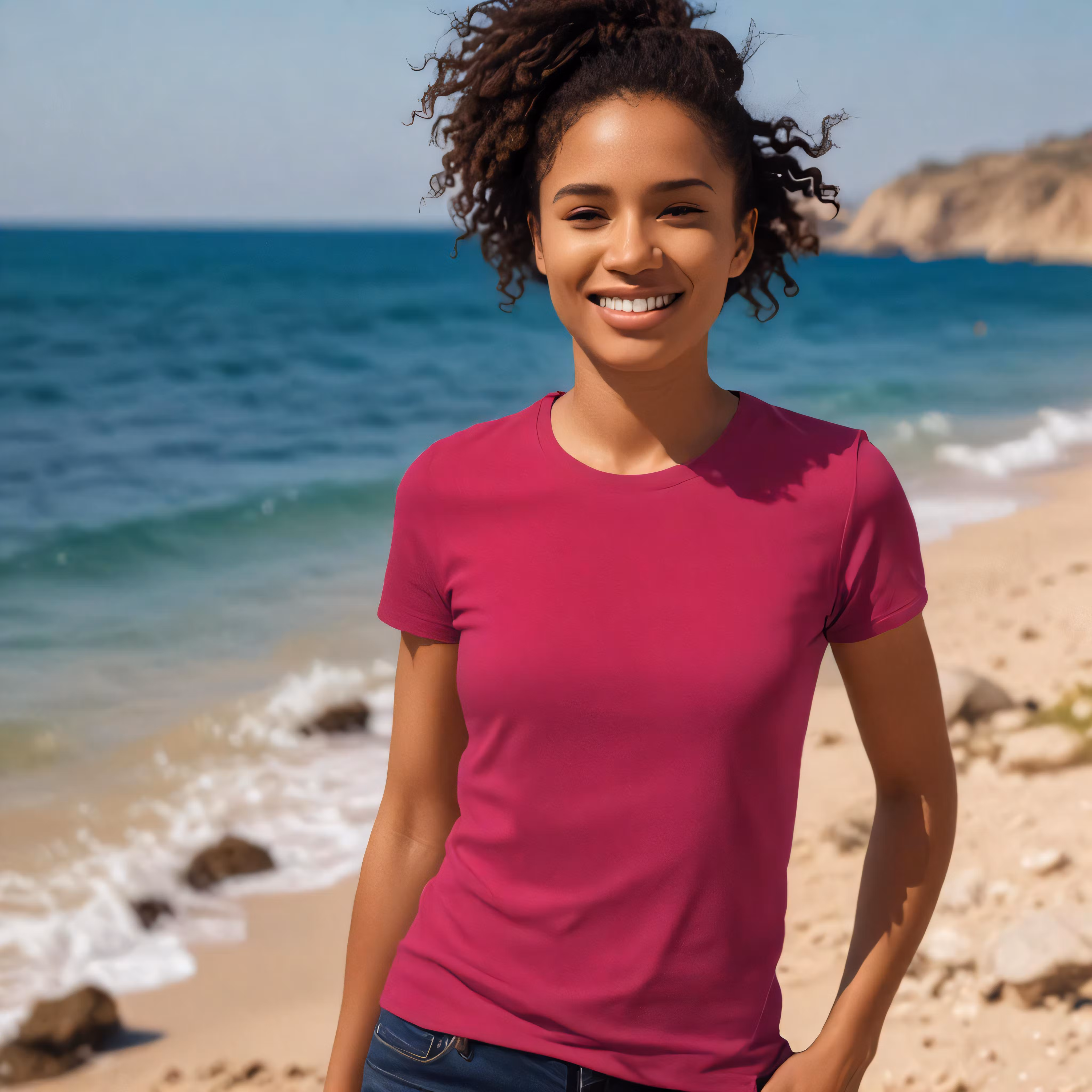 High resolution picture, free to use, a beautiful woman posing on the beach in a bright pink shirt